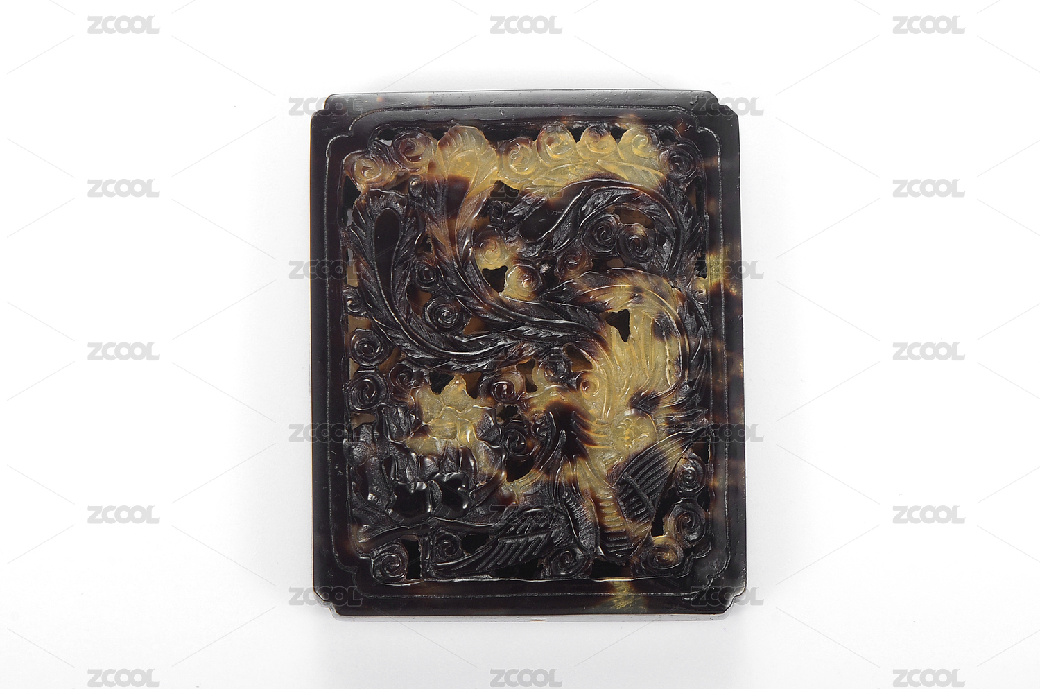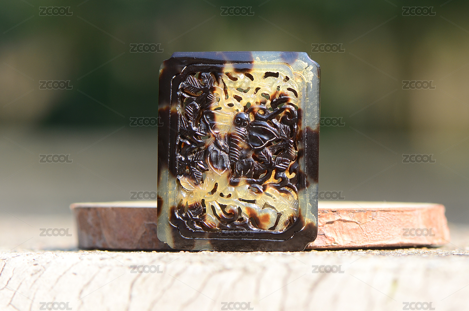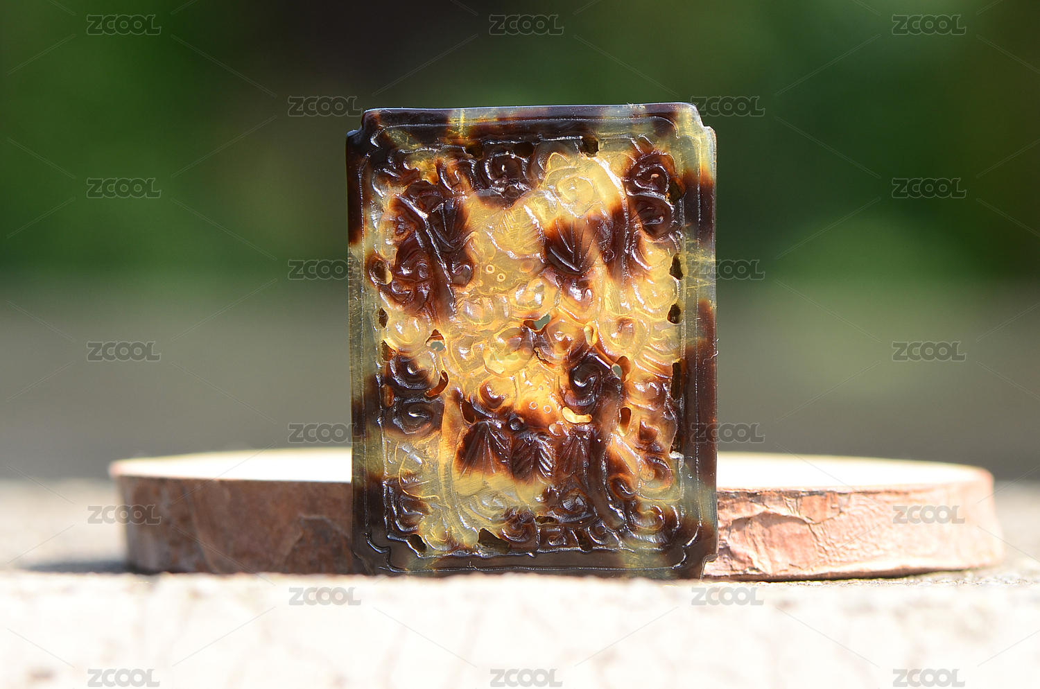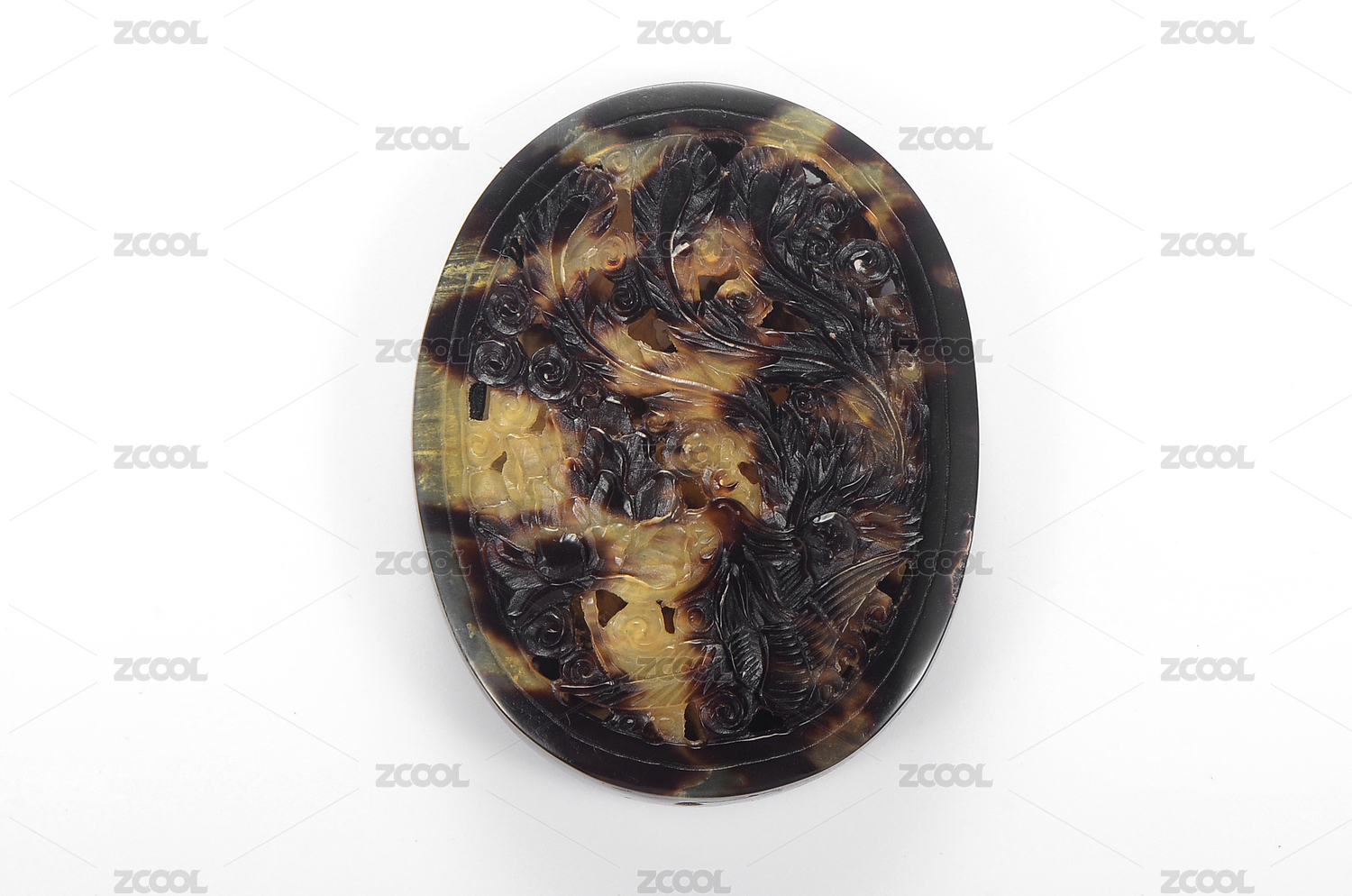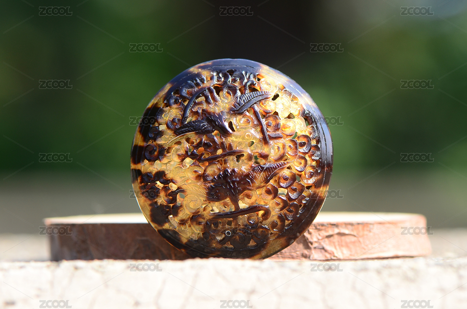 復古虛化背景上的精美雕塑玳瑁花紋吊牌特寫圖片