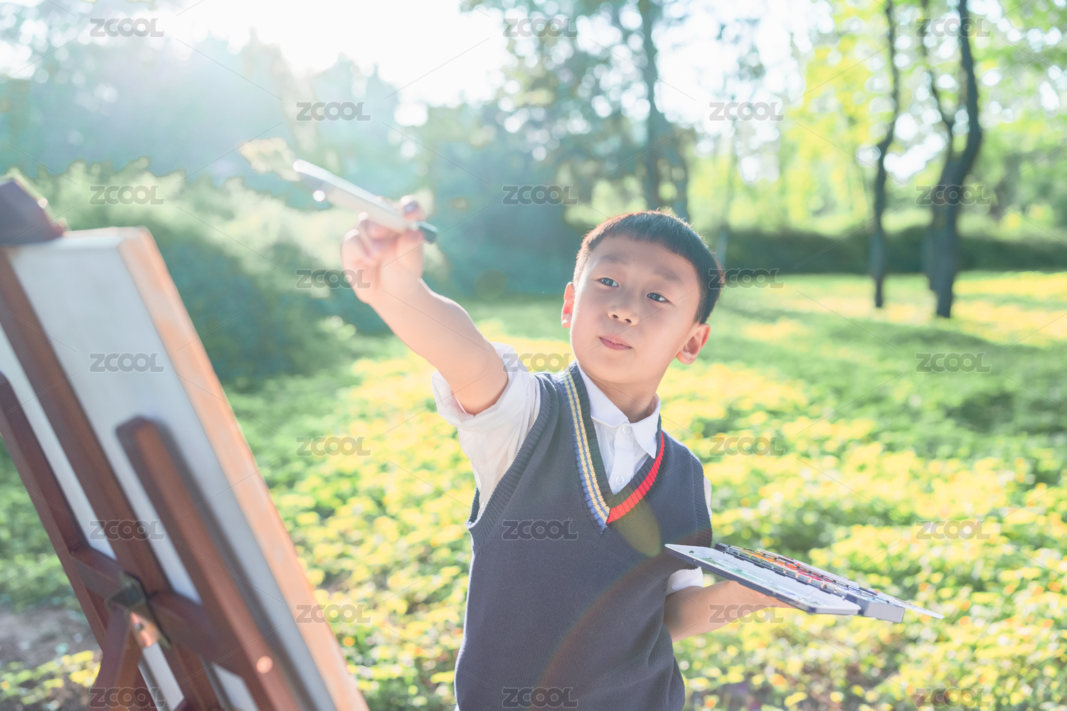 春天戶外亞洲中國男孩手拿畫筆在畫板上畫畫