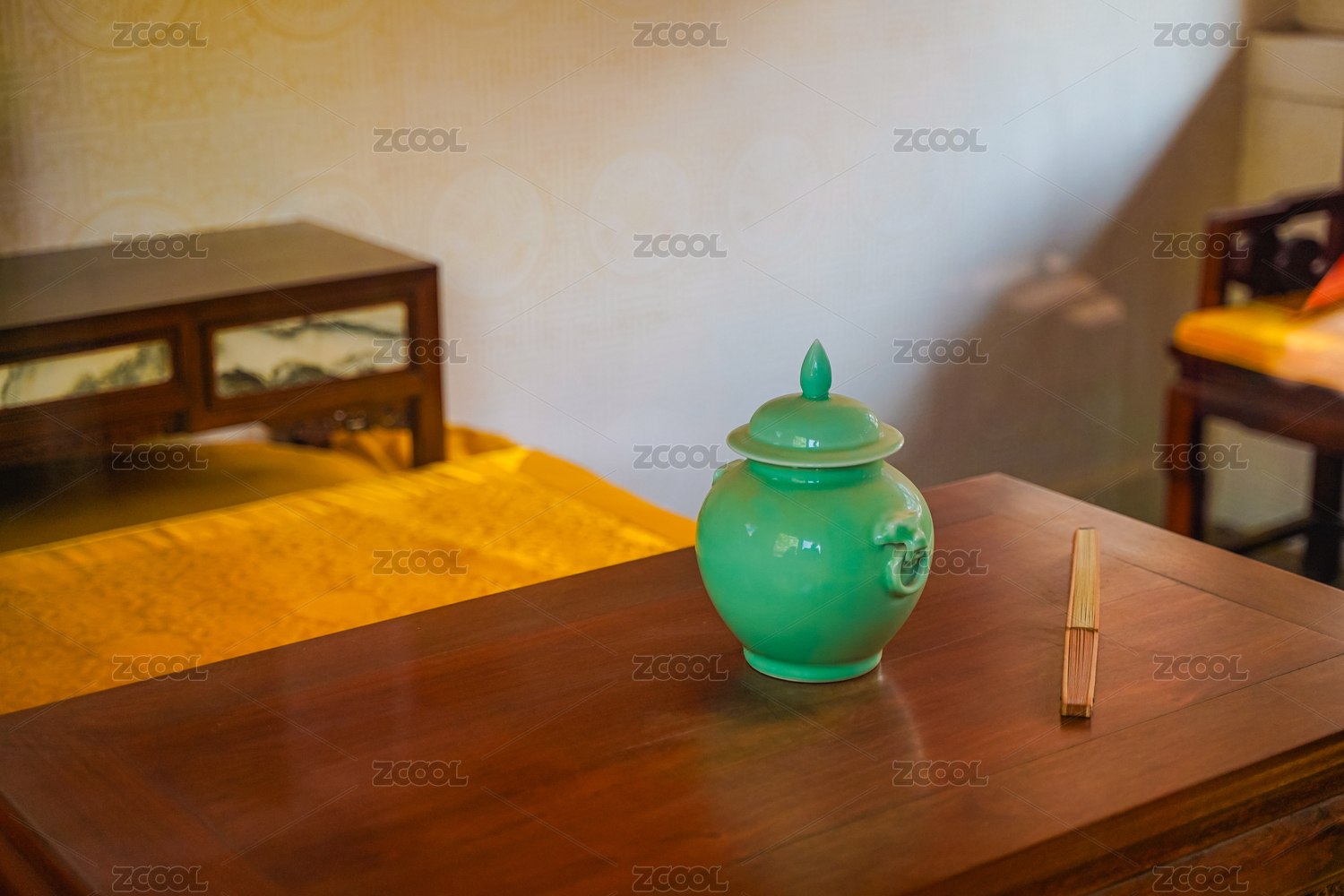 中式房間內(nèi)桌上擺放的瓷器和折扇