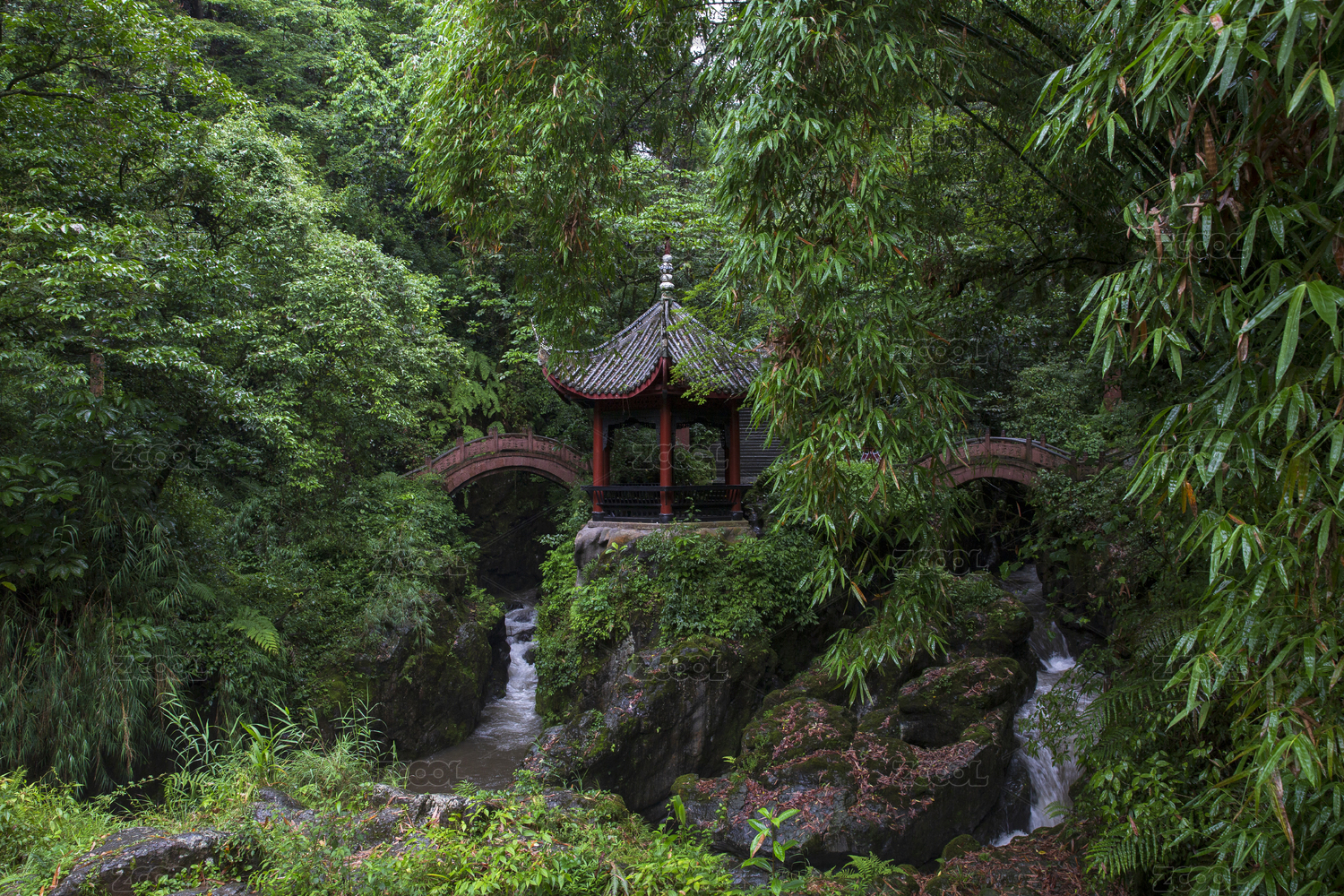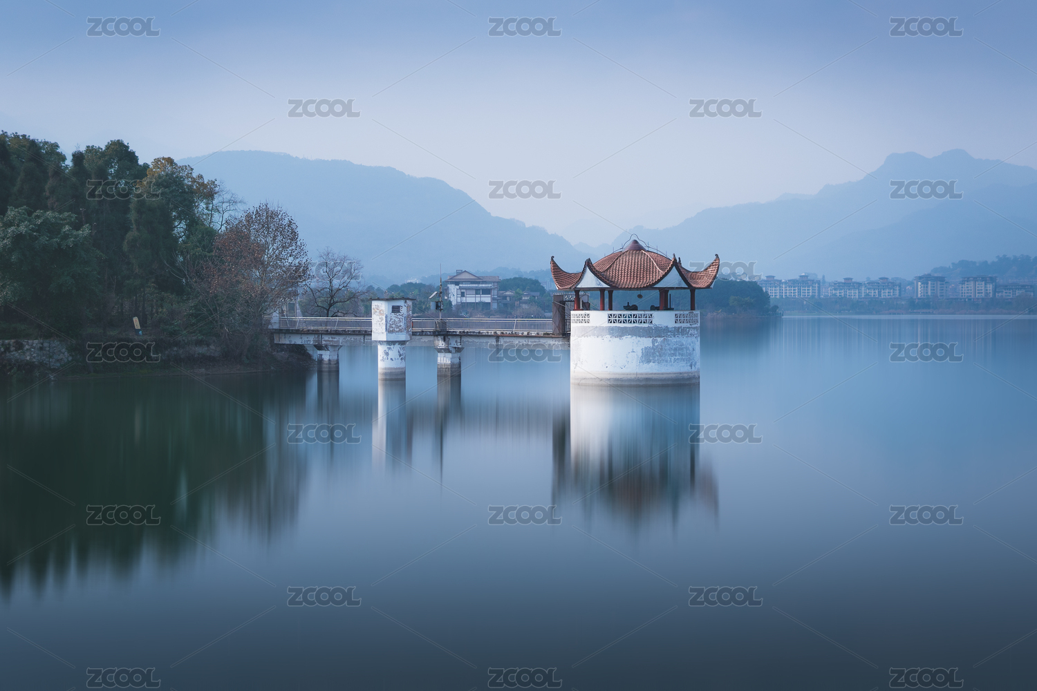 四川峨眉山市秀湖陰雨天湖中的亭子