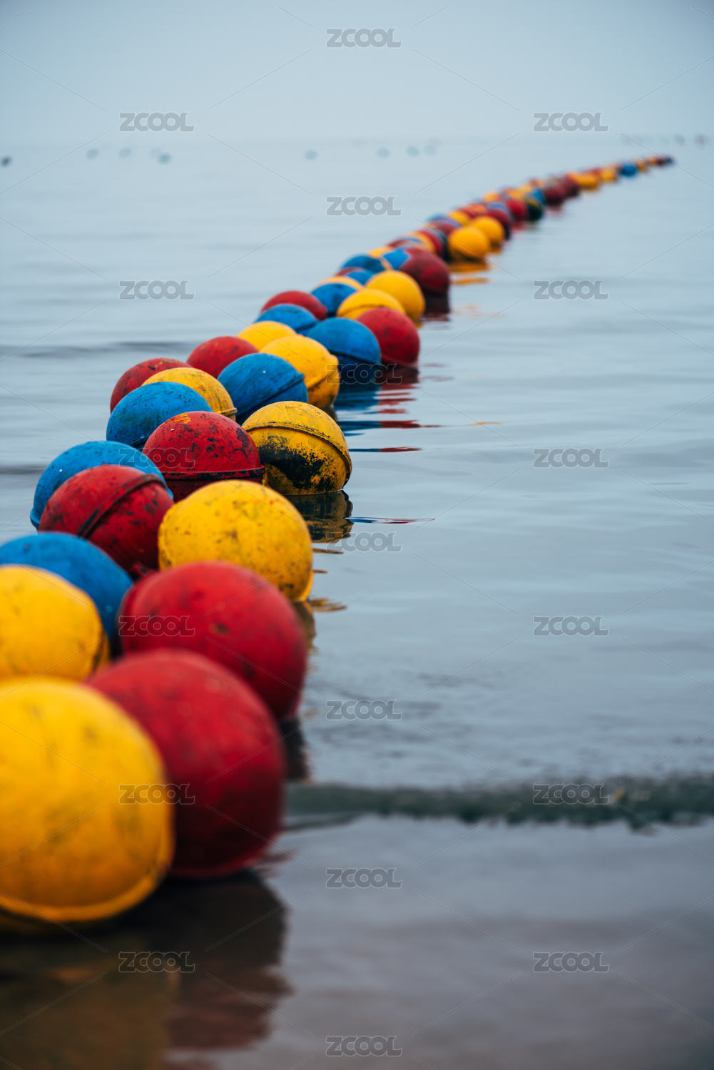 海邊紅黃藍三色的海洋浮標