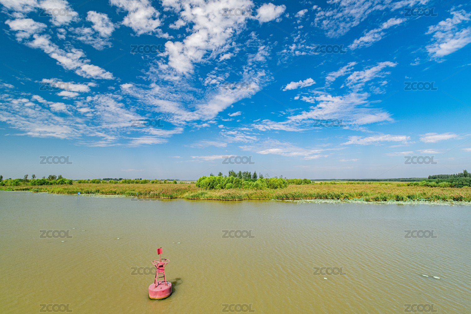 晴天里中國微山湖上的湖面航道浮標和遠處的蘆葦蕩