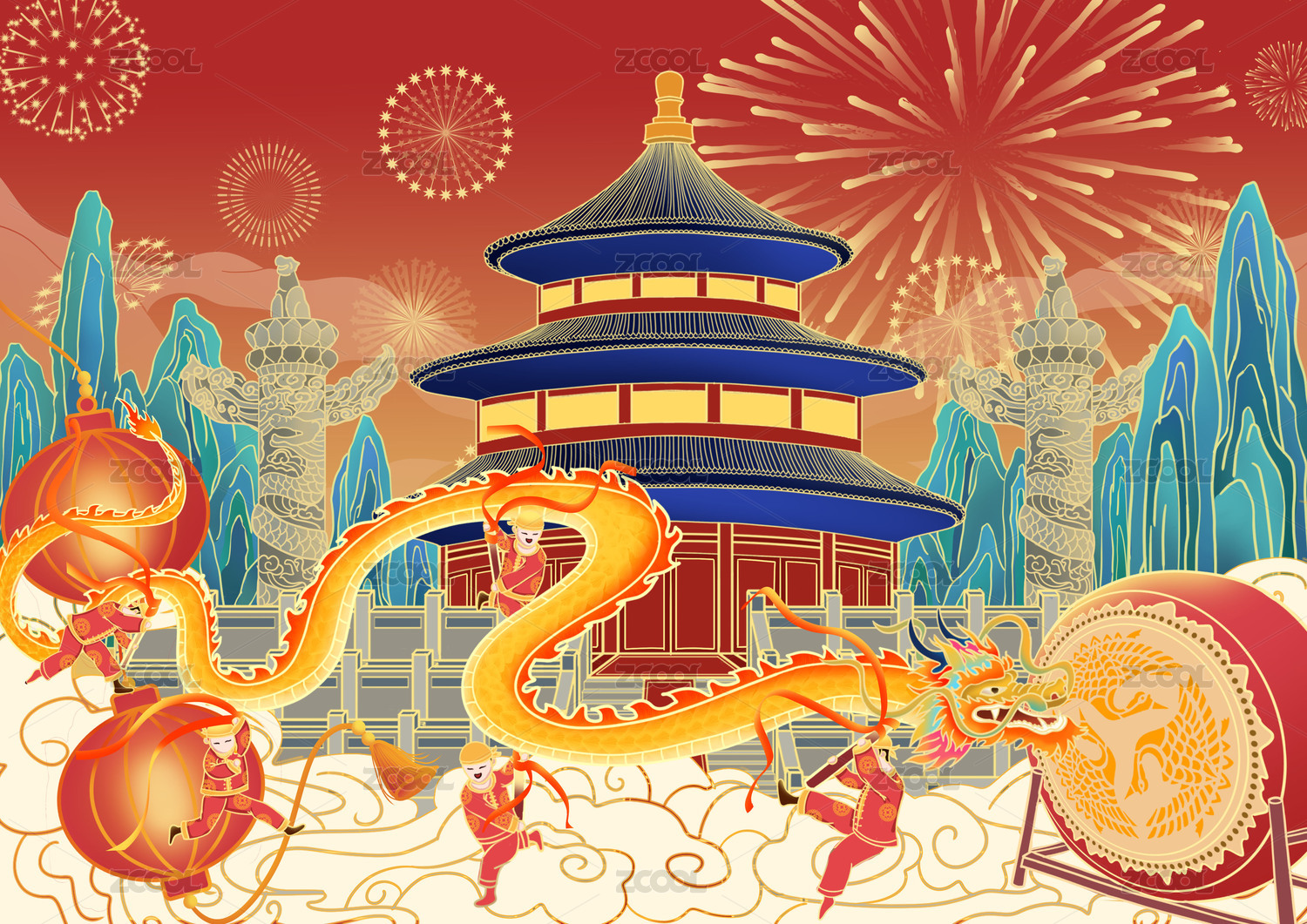 國潮古建筑節(jié)日插畫