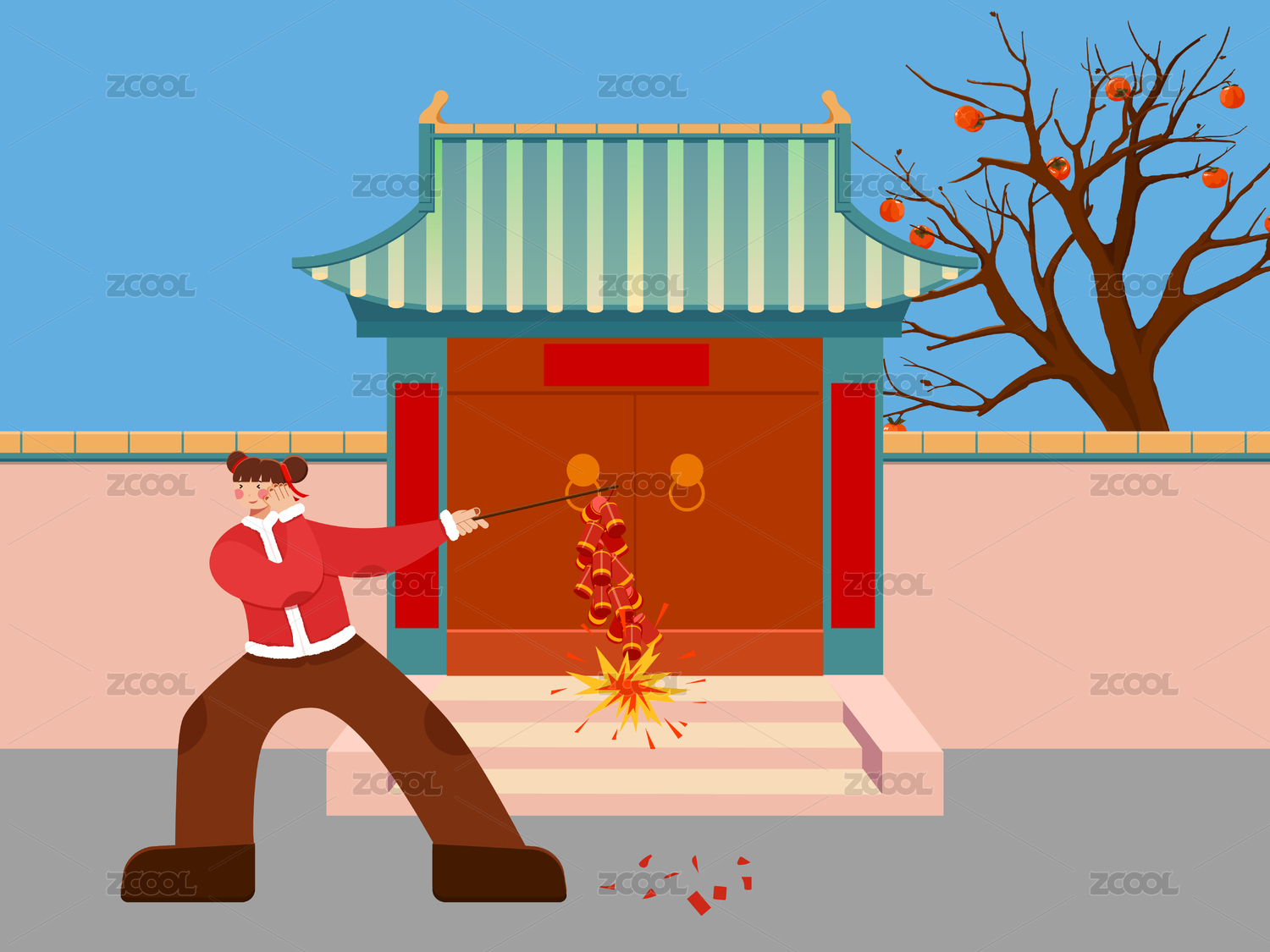 中國傳統(tǒng)年俗大年初一放鞭炮插畫
