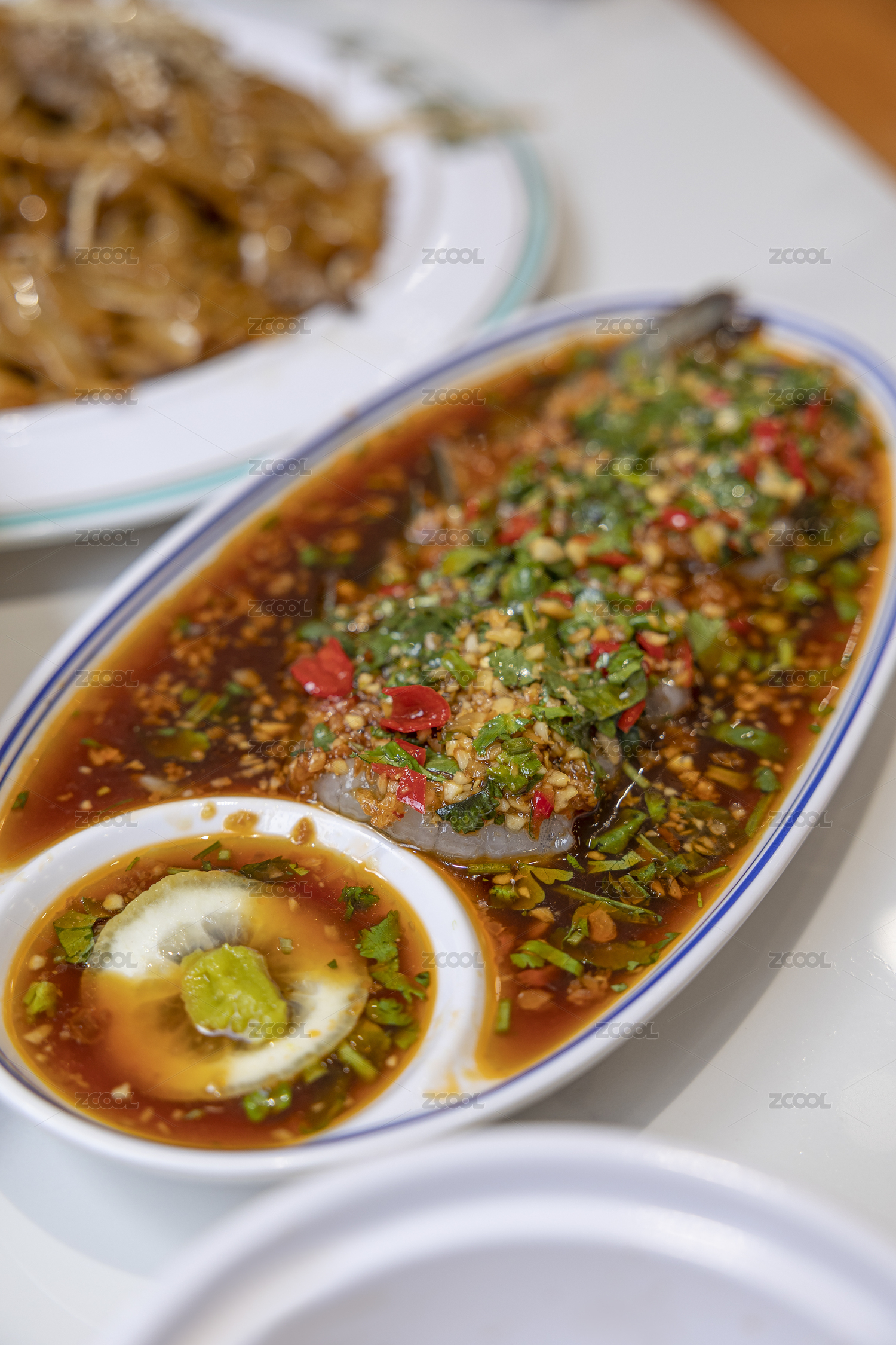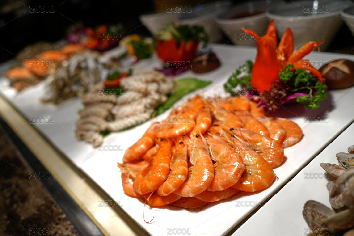 自助餐廳里的餐臺上放著豐富多樣的海鮮料理