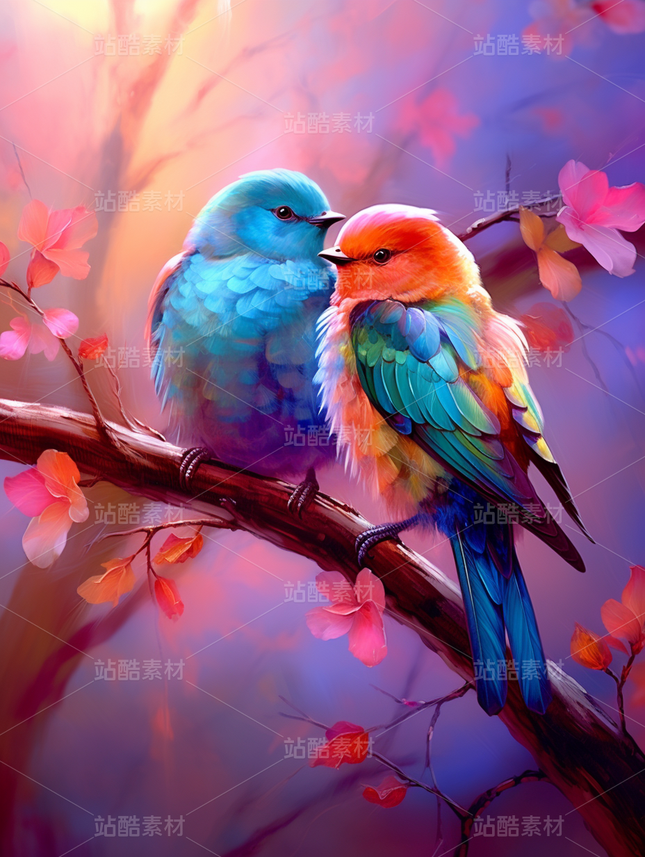 彩色小鳥(niǎo)鸚鵡照片插畫(huà)恩愛(ài)中國(guó)風(fēng)