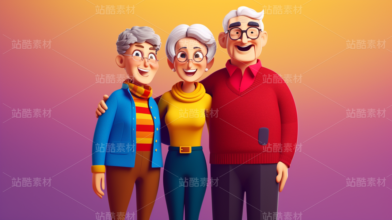 彩色3D卡通人物一家人老年人夫妻恩愛(ài)