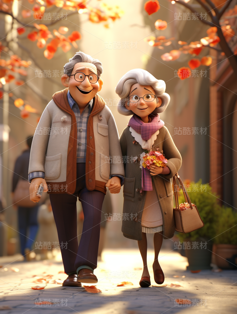 3D卡通人物老年人夫妻恩愛(ài)彩色健康