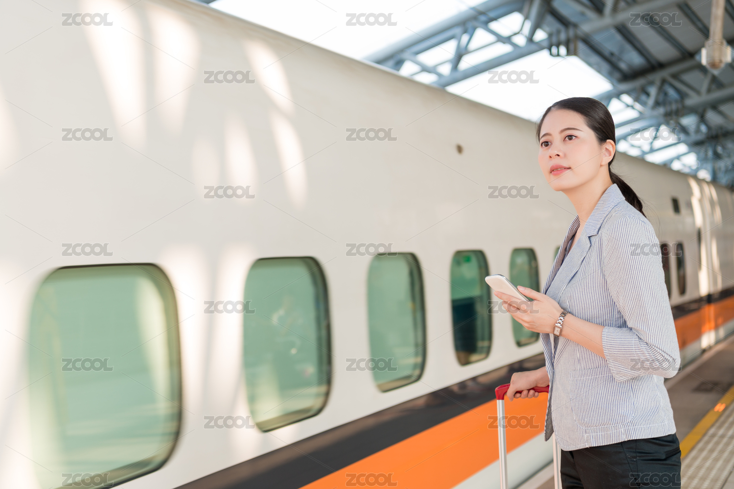 亞裔女商人等待她的列車到站,并停止對她的運輸準備開始她的旅程得到。