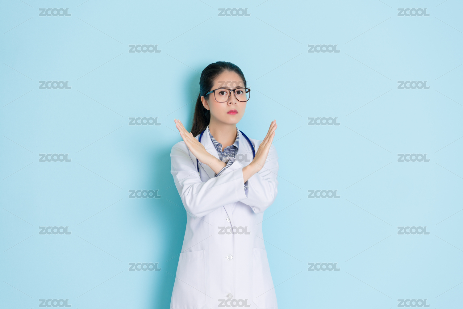 平靜的職業(yè)女性診所醫(yī)生雙手掌心交叉決策拒絕的手勢停止濫用的人在孤立藍色墻壁背景的醫(yī)療資源。