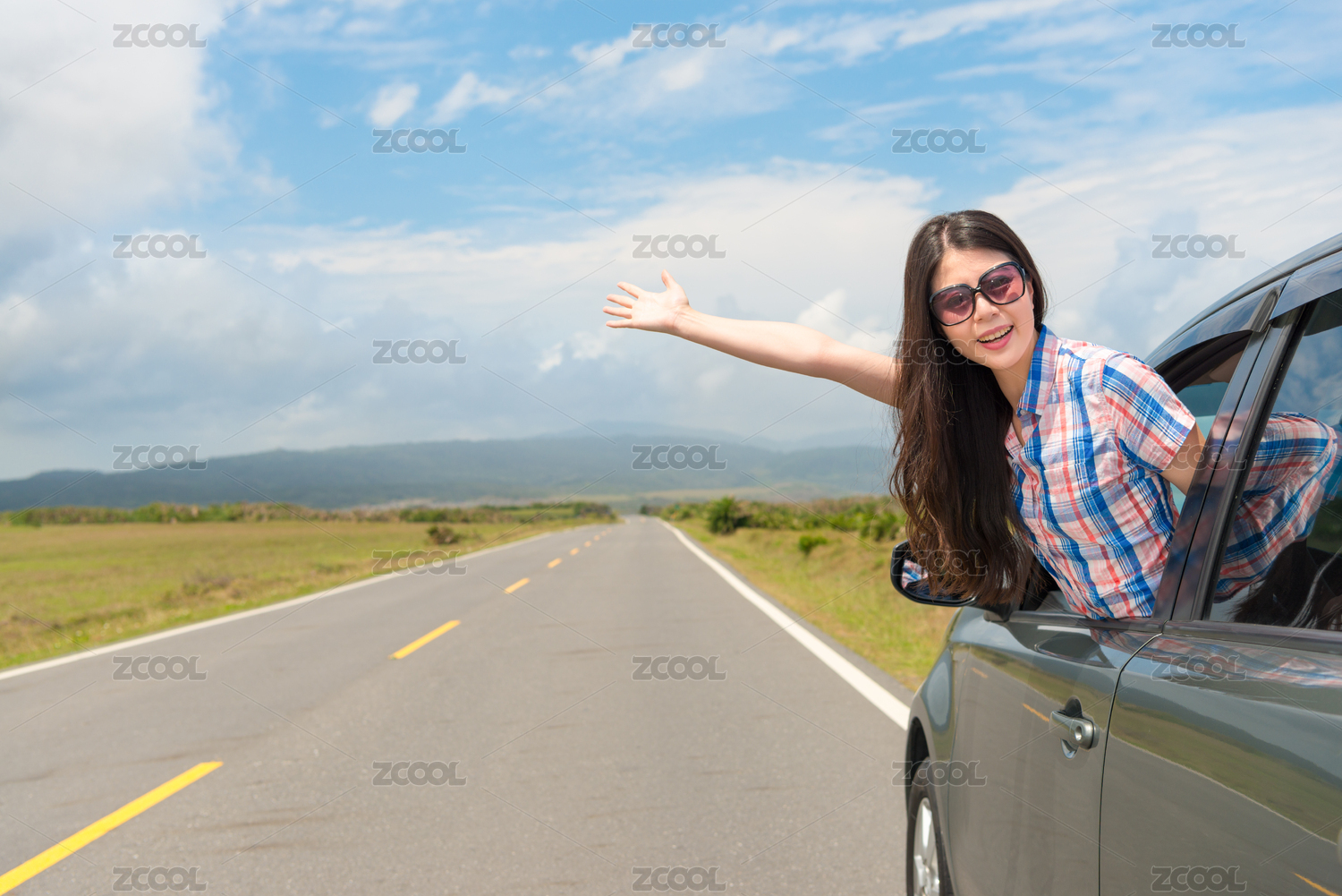 微笑的女人戴著墨鏡很樂意以展示手勢分享田園風光在車窗外,在暑假停止柏油路上。