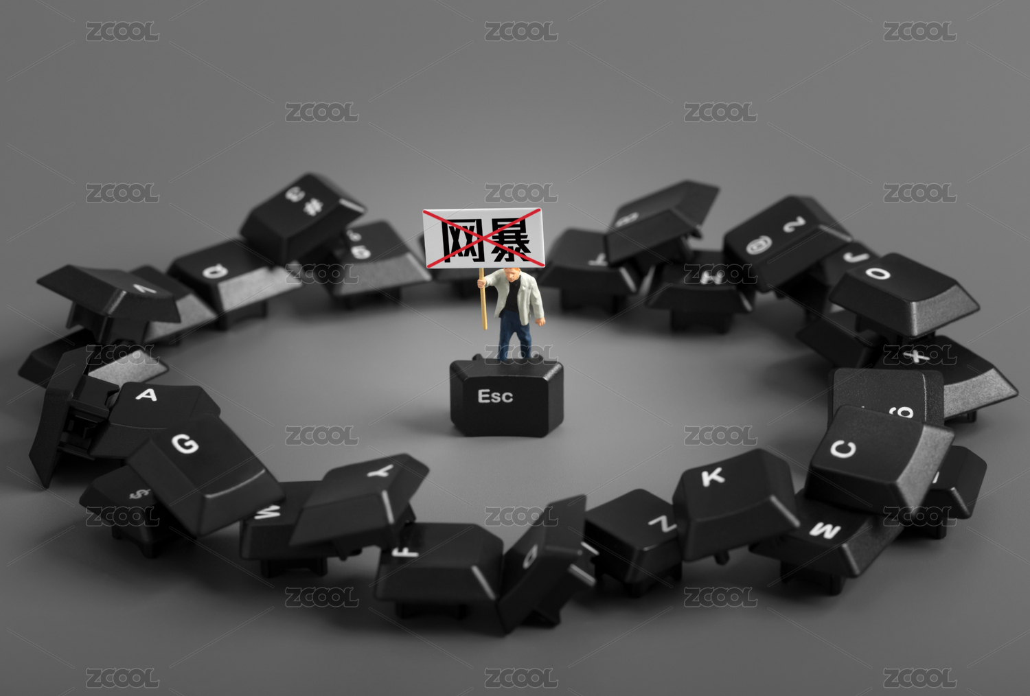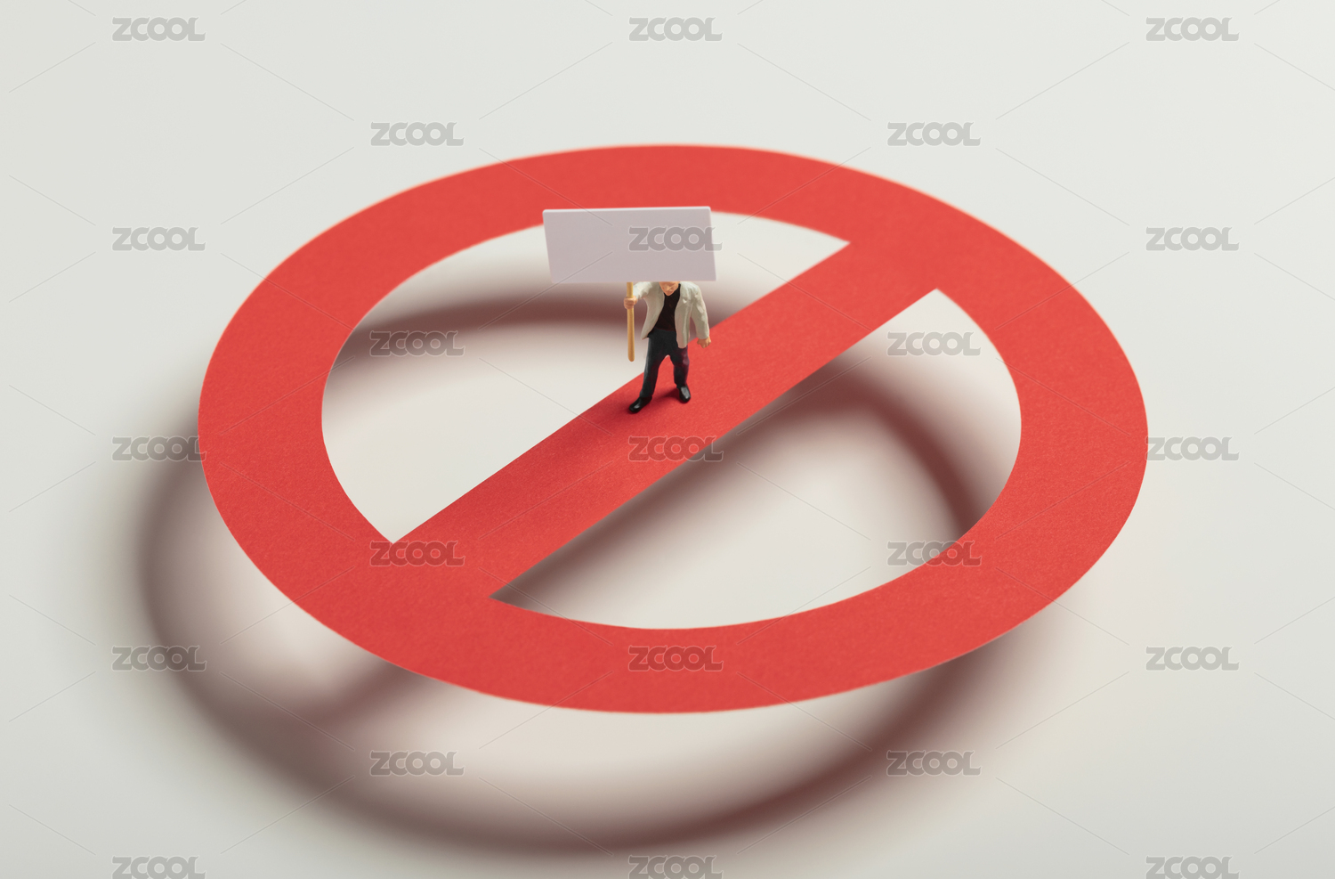 微縮創(chuàng)意站在禁止符號上舉著空白牌子的小人