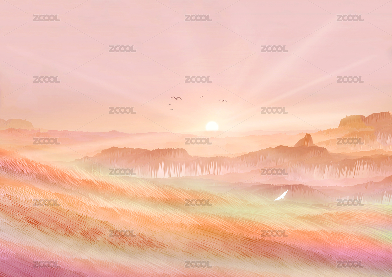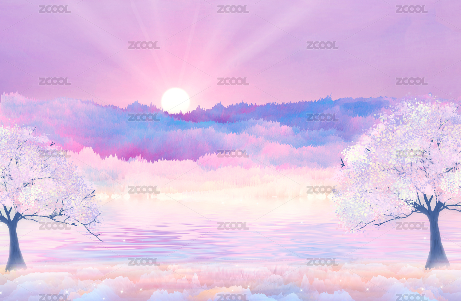 粉色天空下的落雪火山和太陽(yáng)