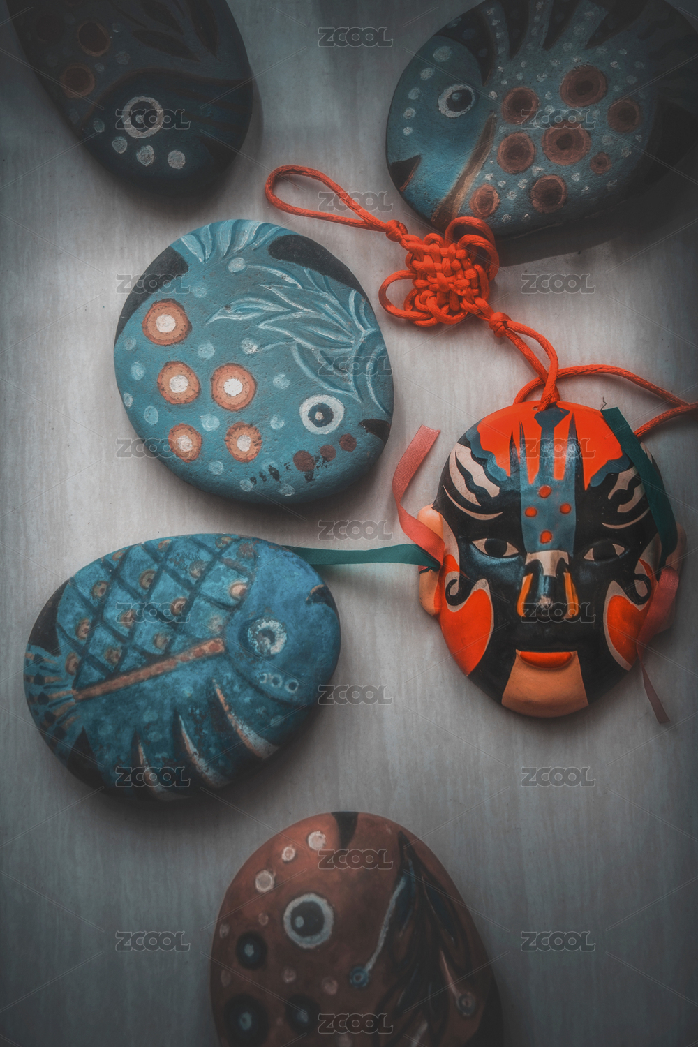 京劇臉譜與畫魚的鵝卵石