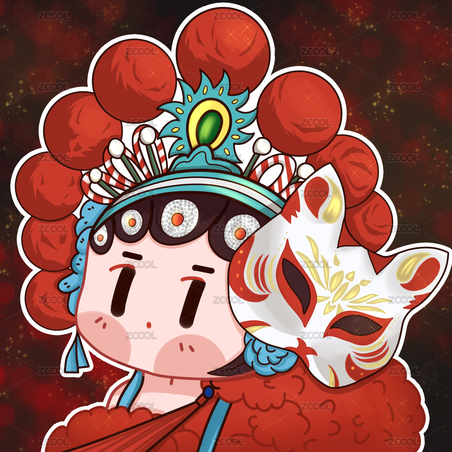 古代京劇臉譜頭像插畫女生卡通扮相狐貍