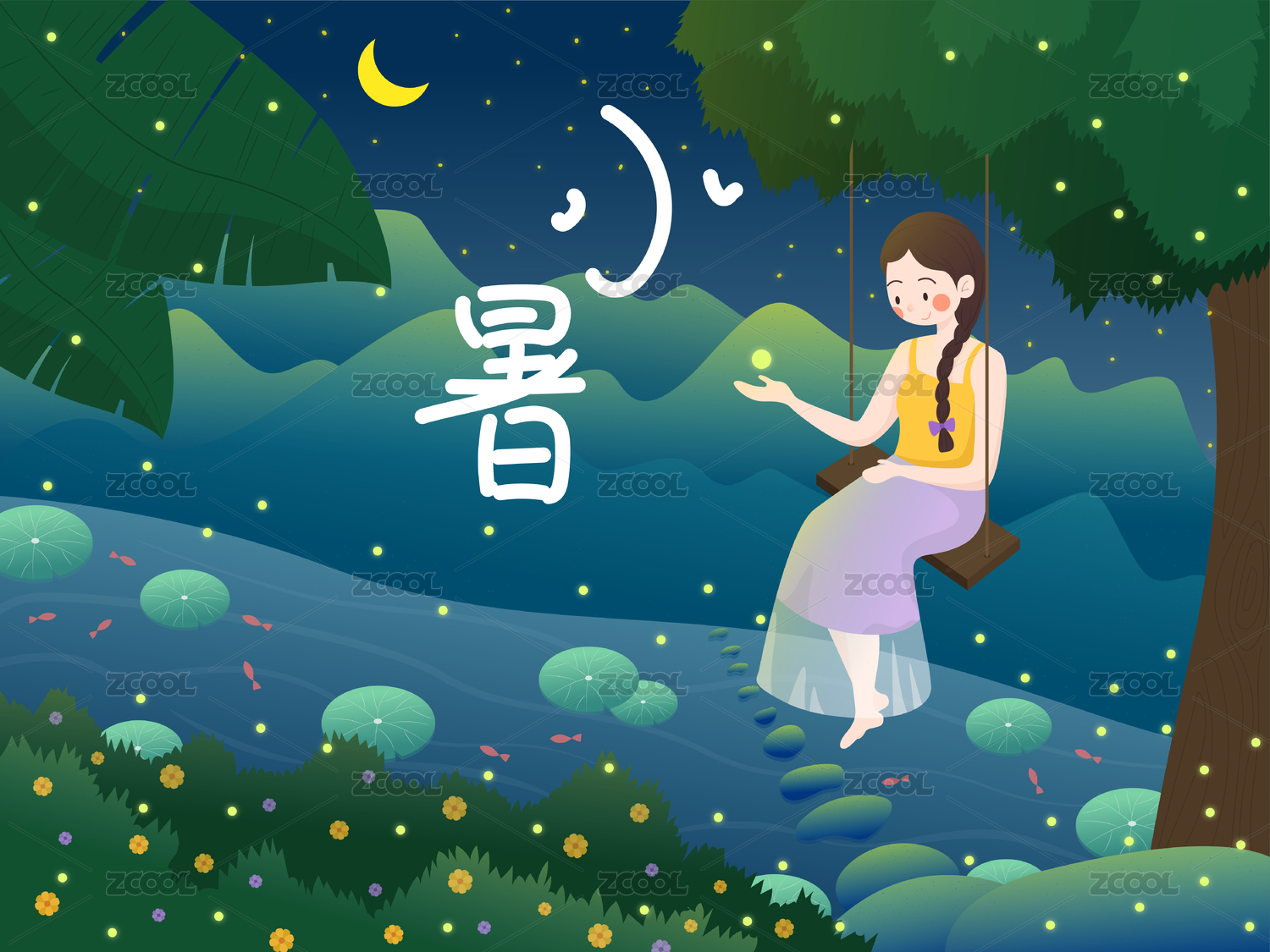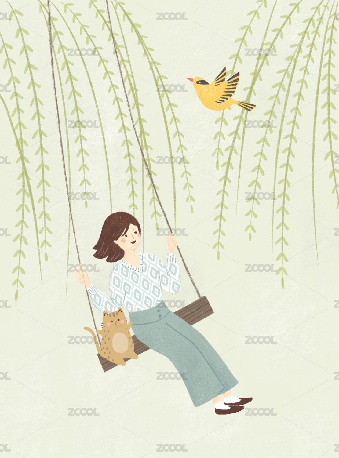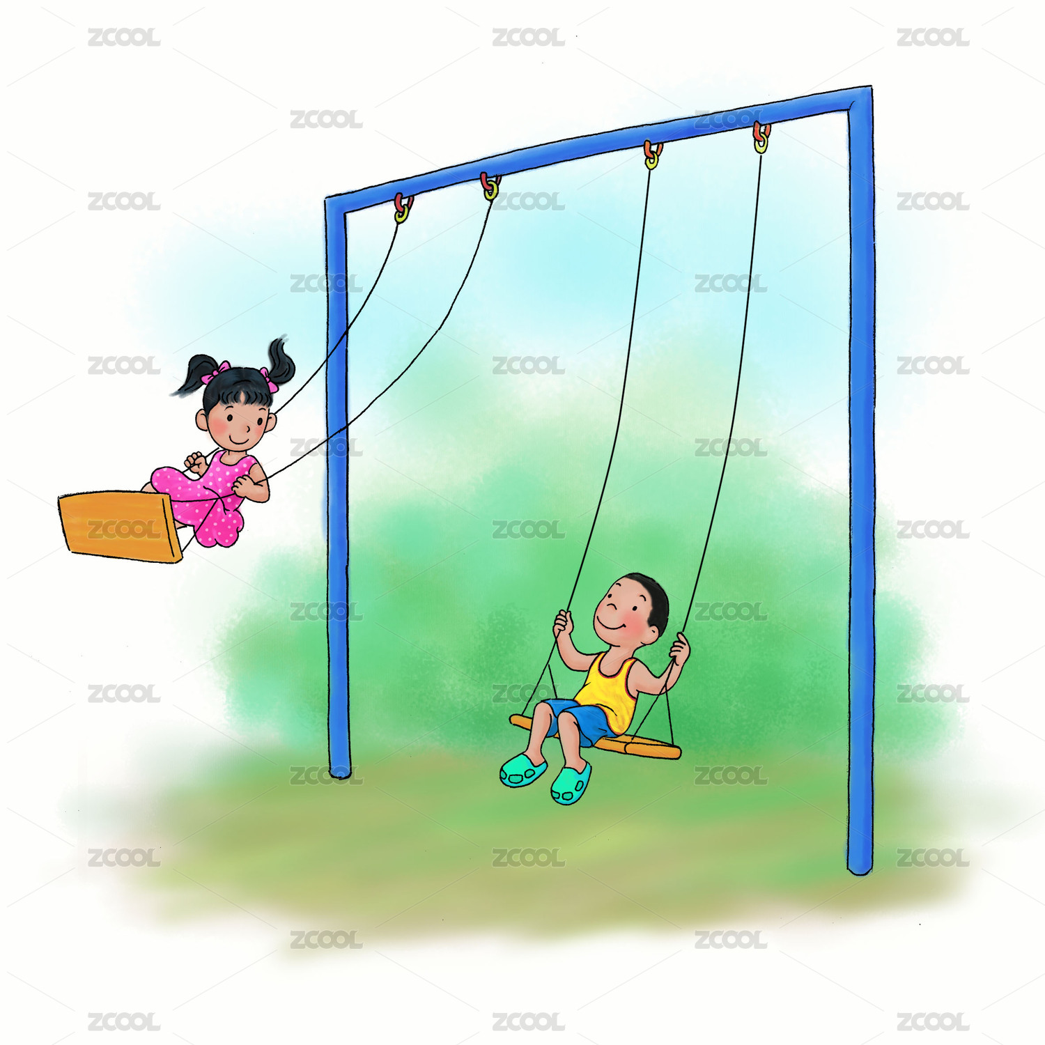 春天在公園草地花叢中蕩秋千的女孩插畫