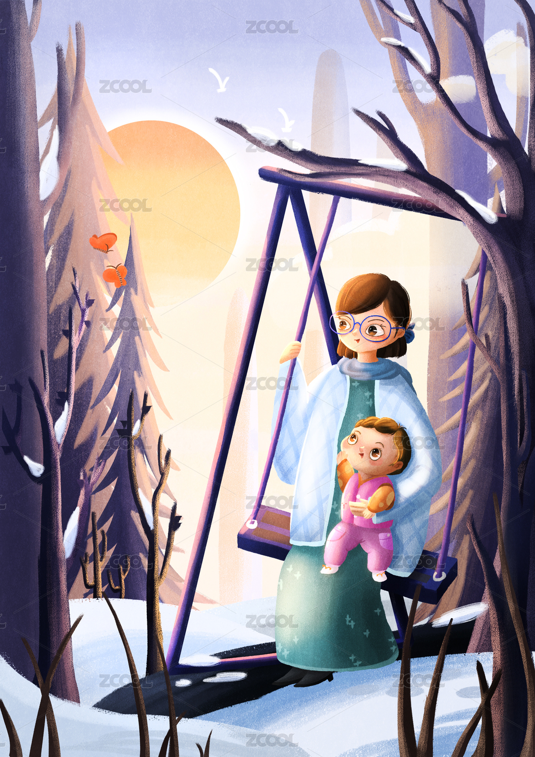 冬日暖陽下媽媽抱著寶寶在公園里蕩秋千