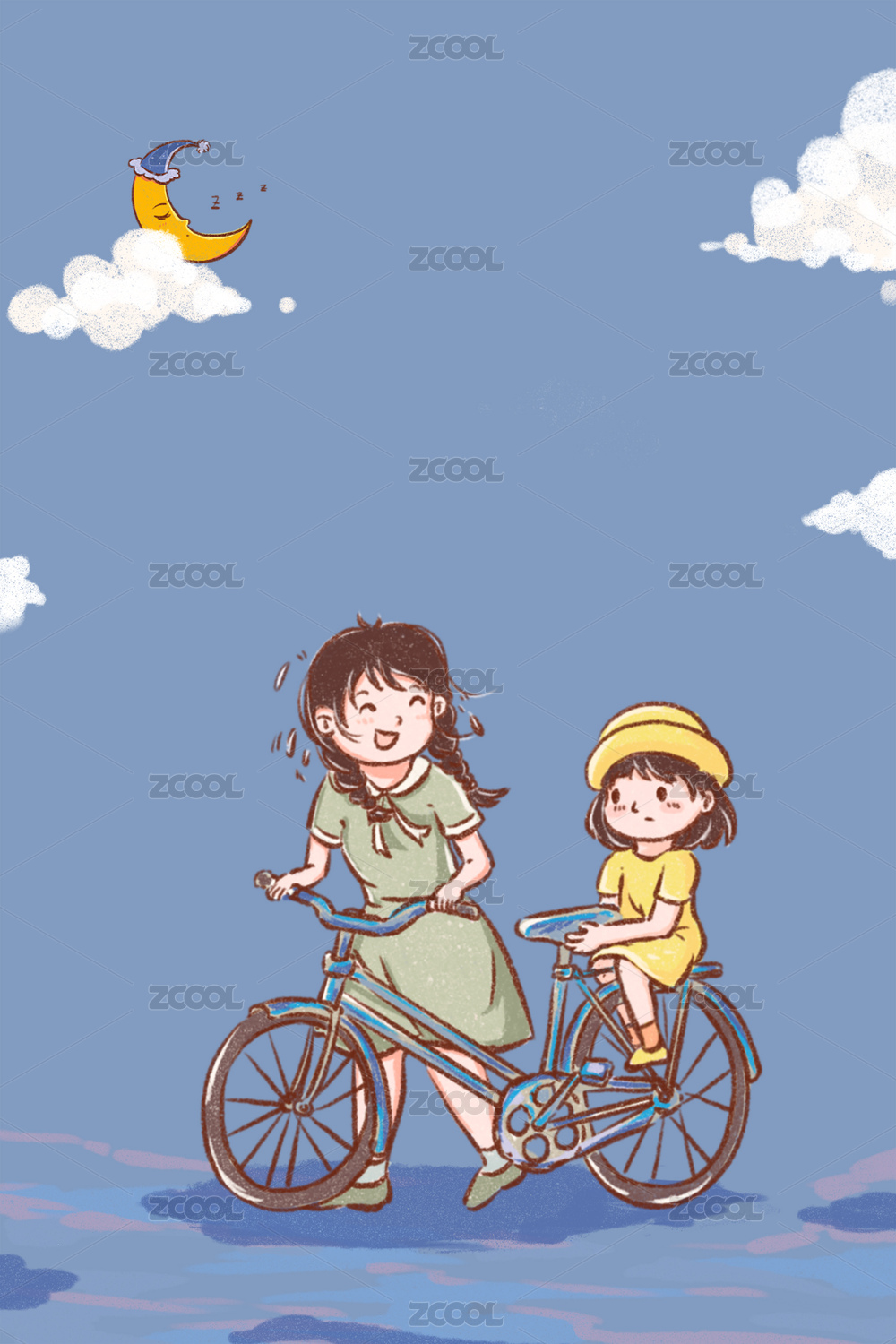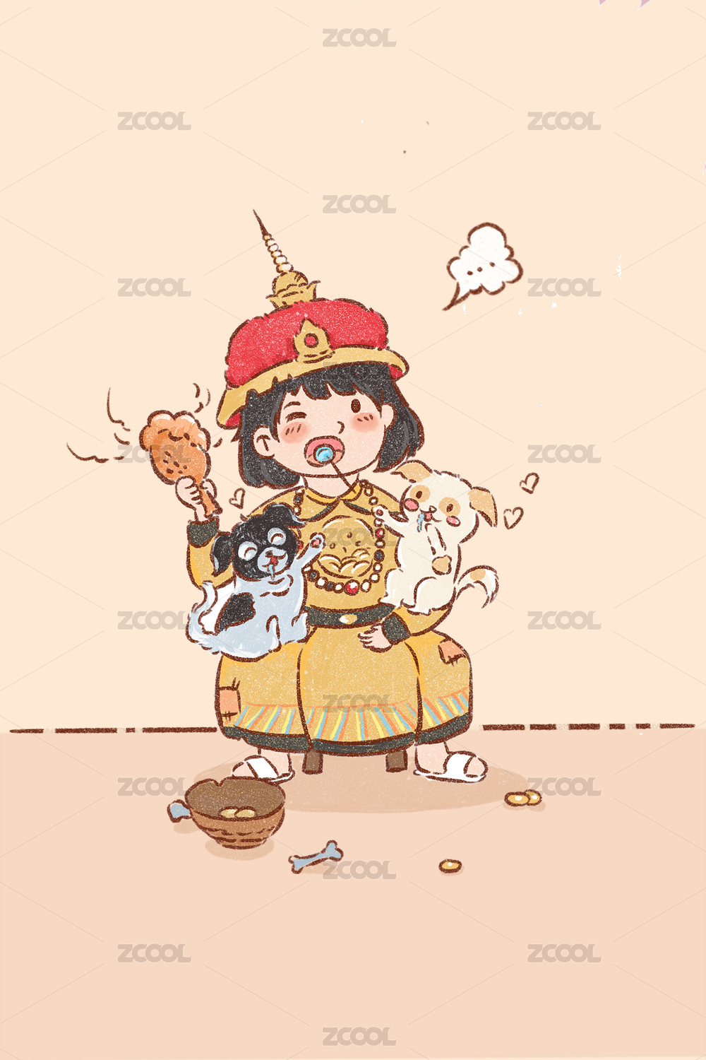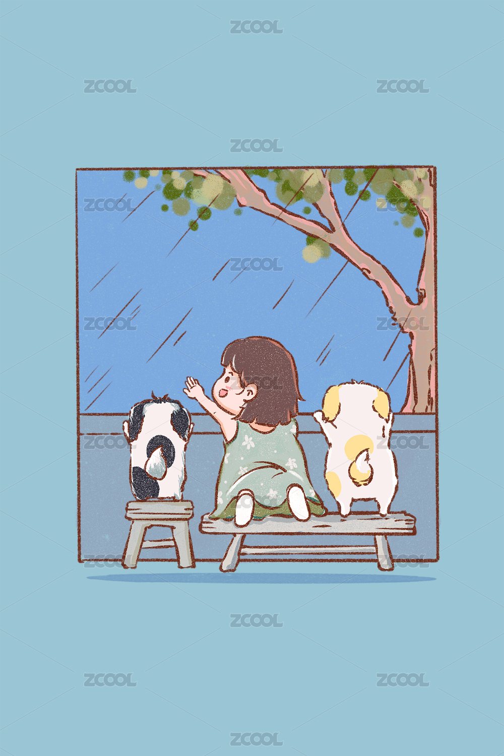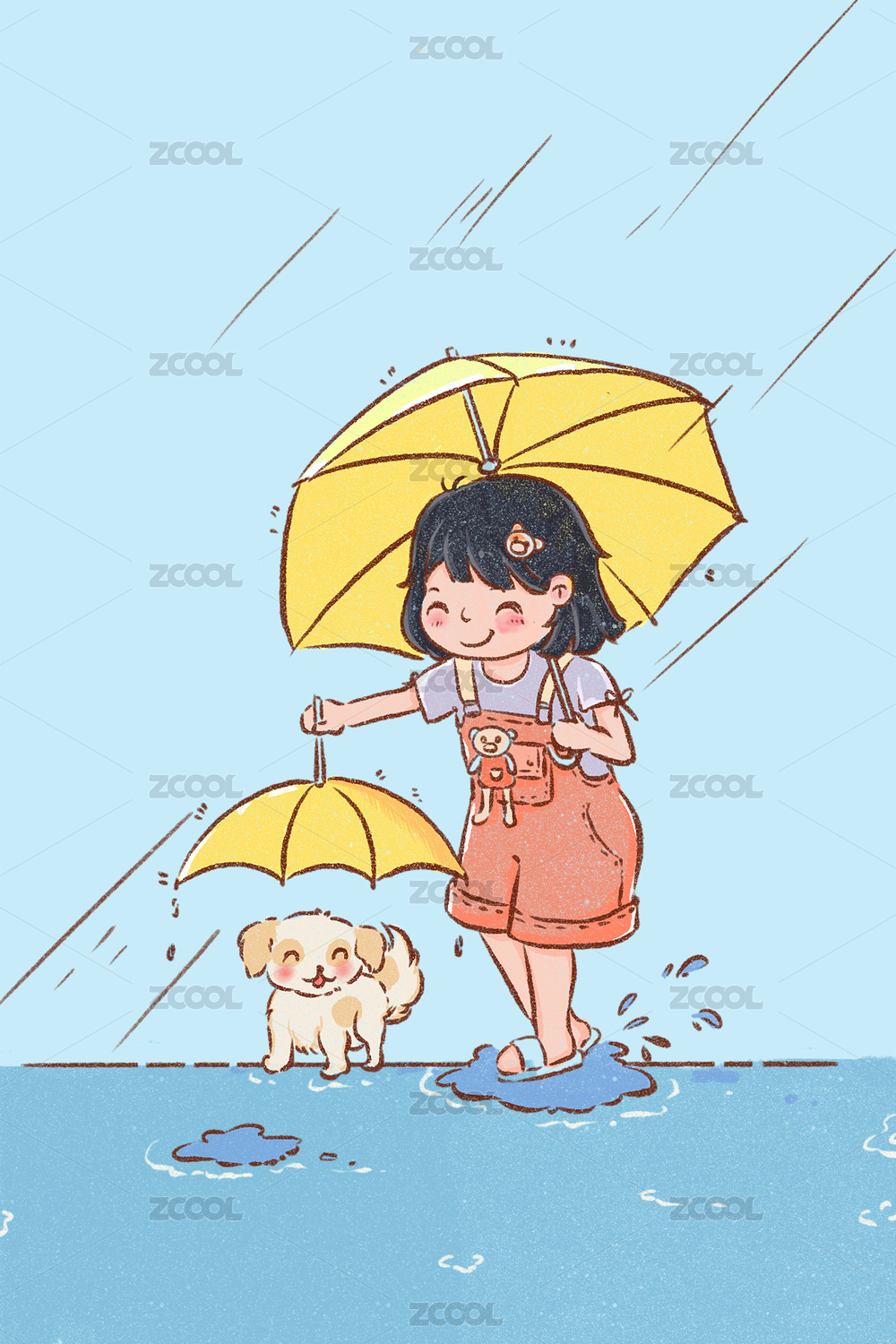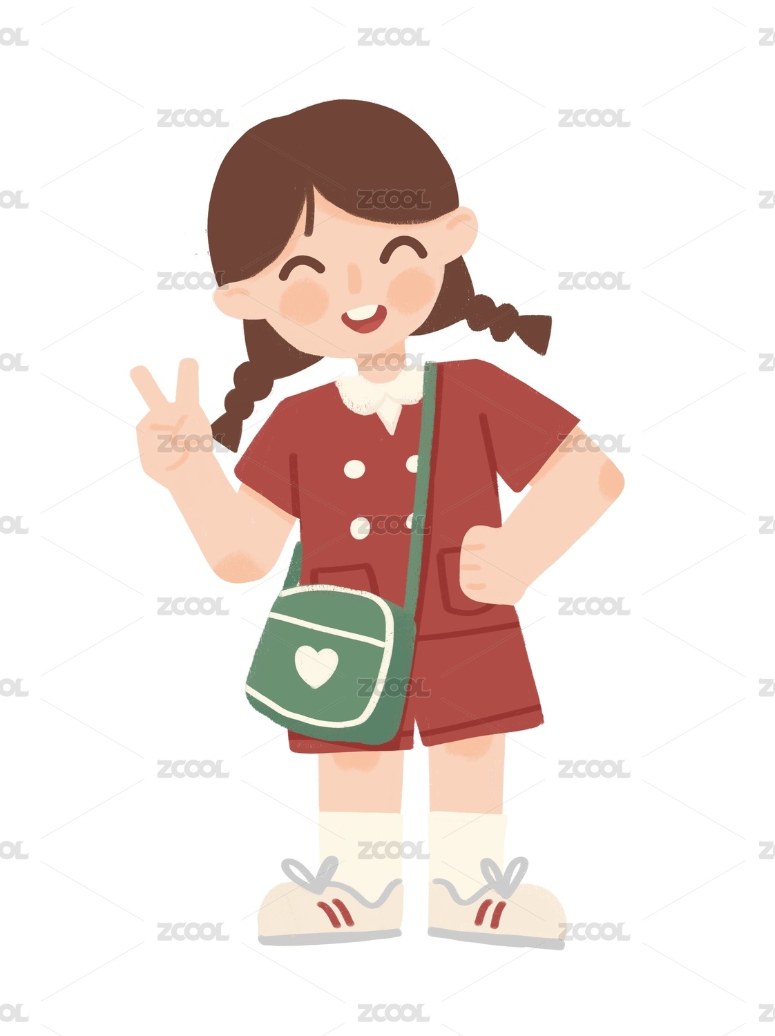 手繪插畫(huà)可愛(ài)的小女孩開(kāi)心地笑著背著單肩包