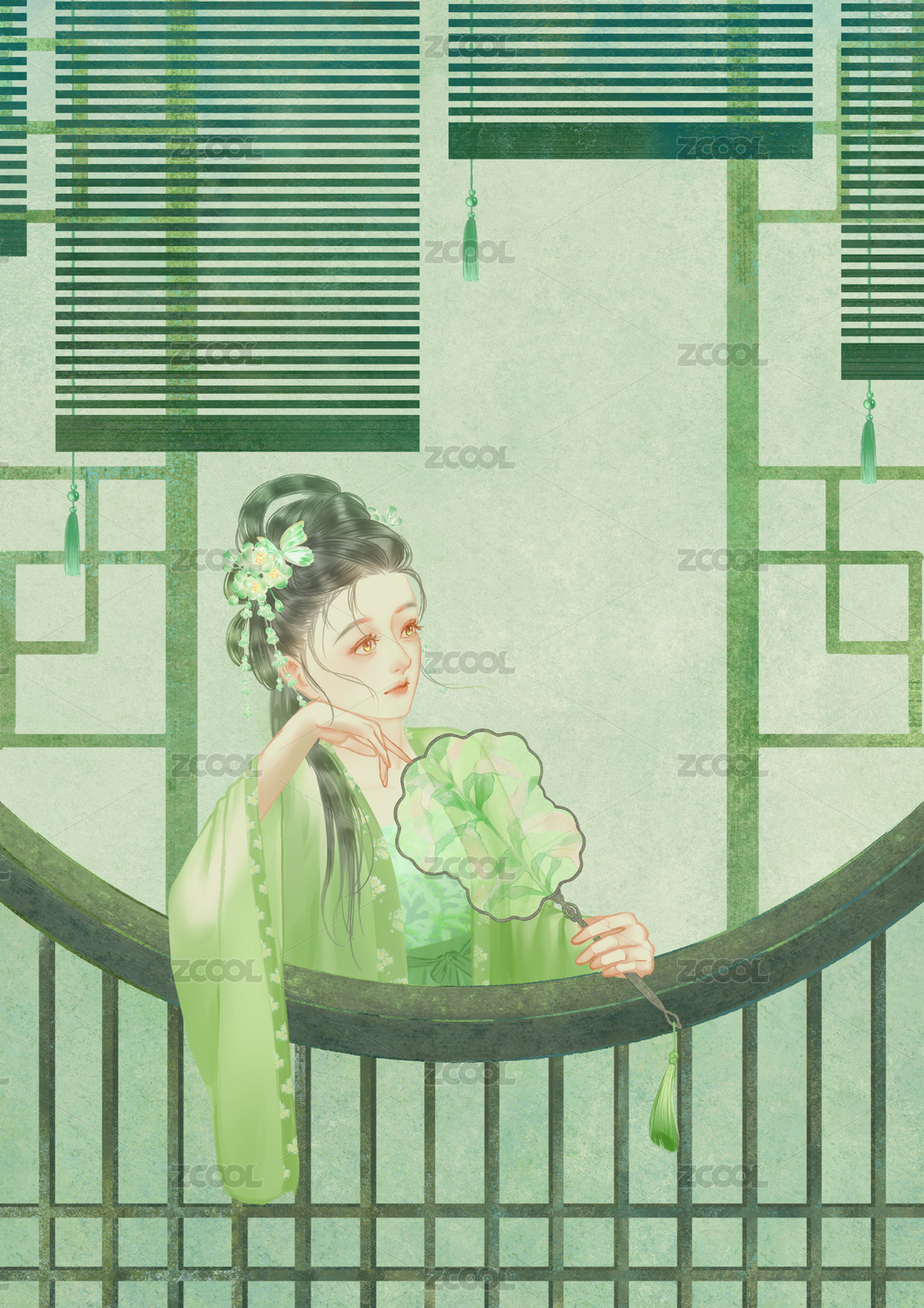 古風(fēng)漢服女人扇子竹簾窗簾卷簾門框隔斷屏風(fēng)
