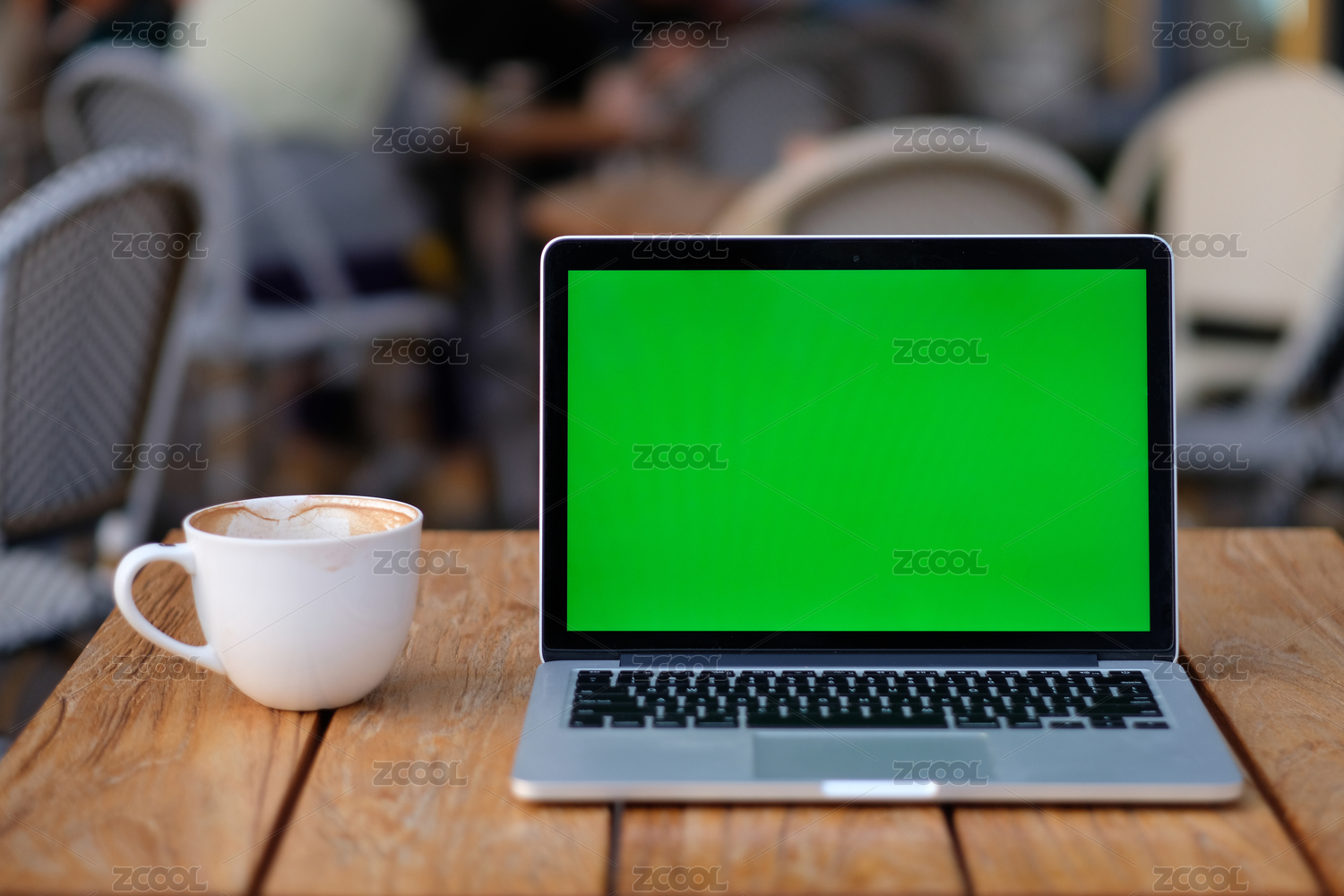 空白綠色屏幕的筆記本電腦和一杯咖啡