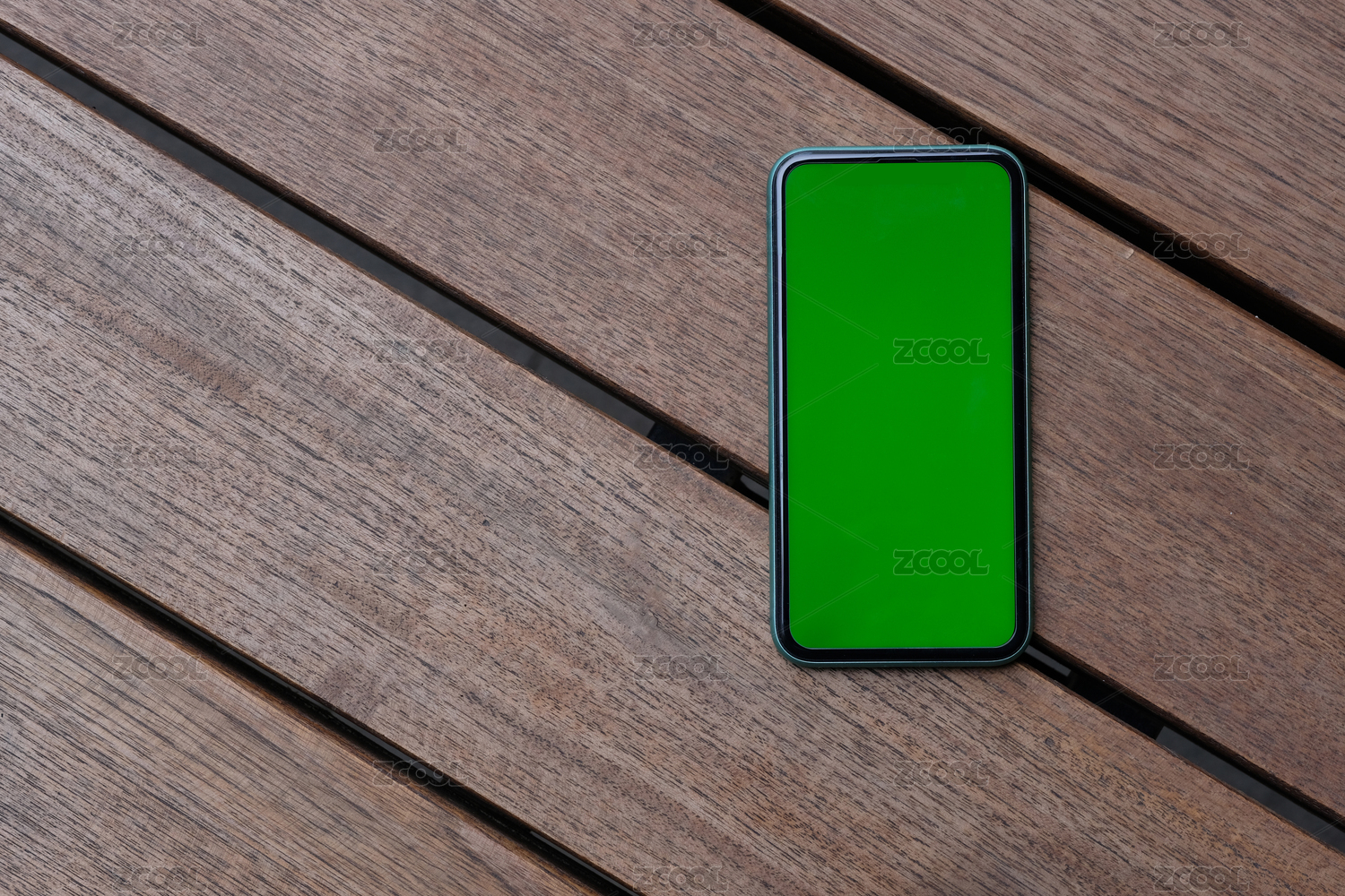 俯拍一個(gè)綠色空白屏幕的手機(jī)在桌面上