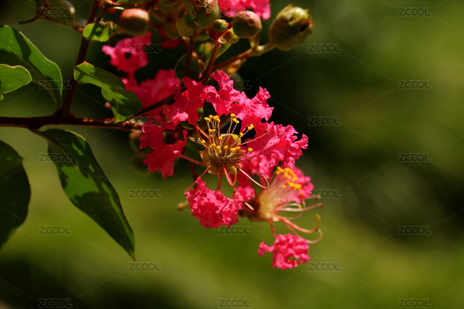 朦朧的綠幕前側(cè)逆光照射下的粉花與黃蕊