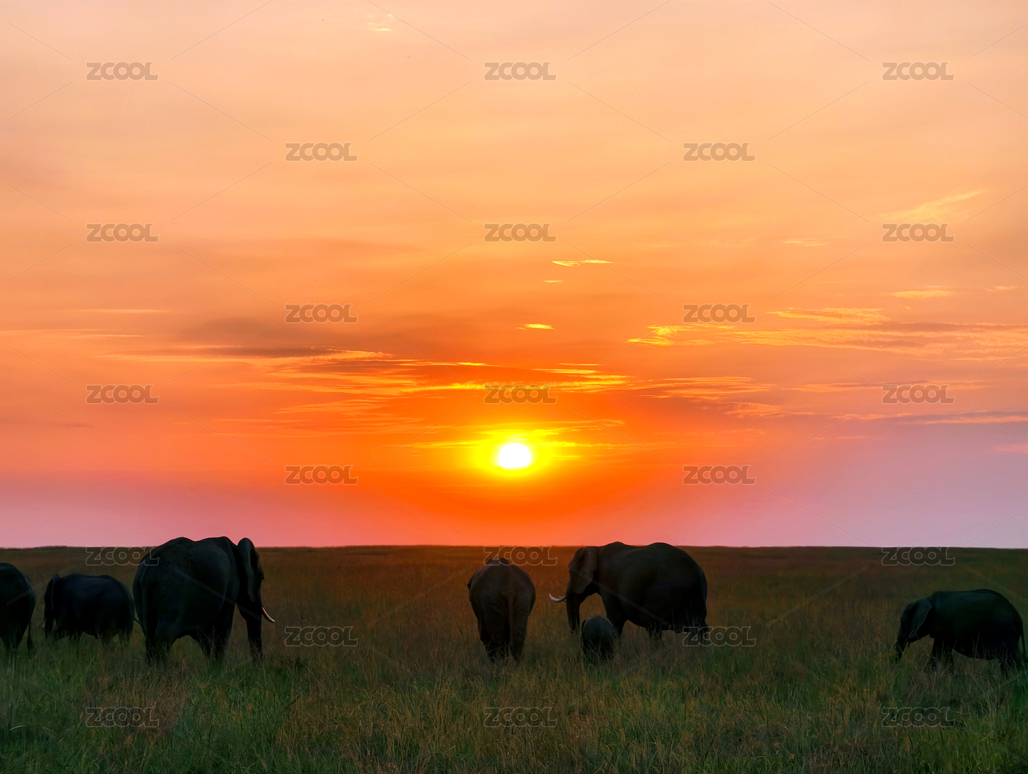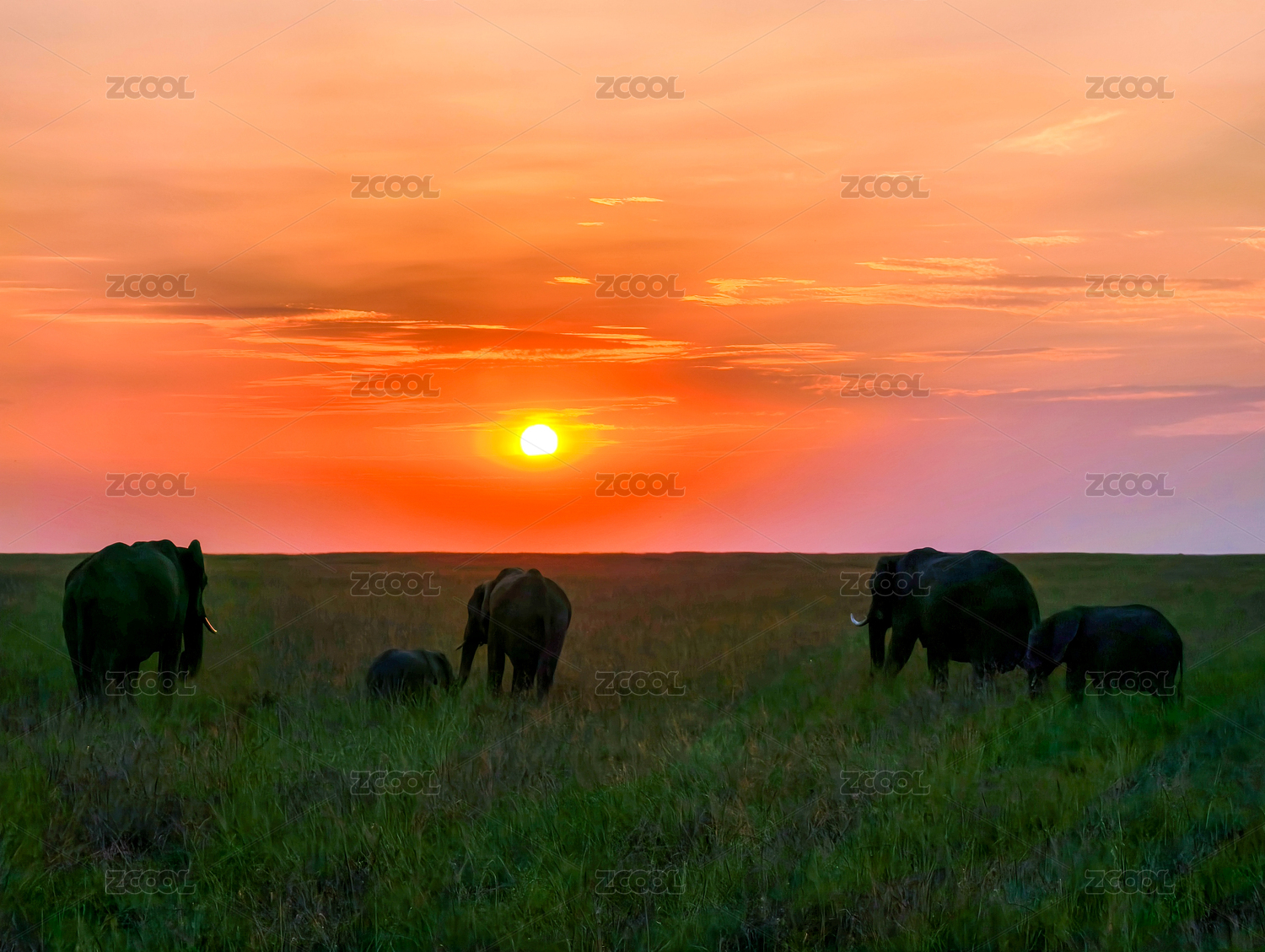 非洲草原日落時(shí)的象群