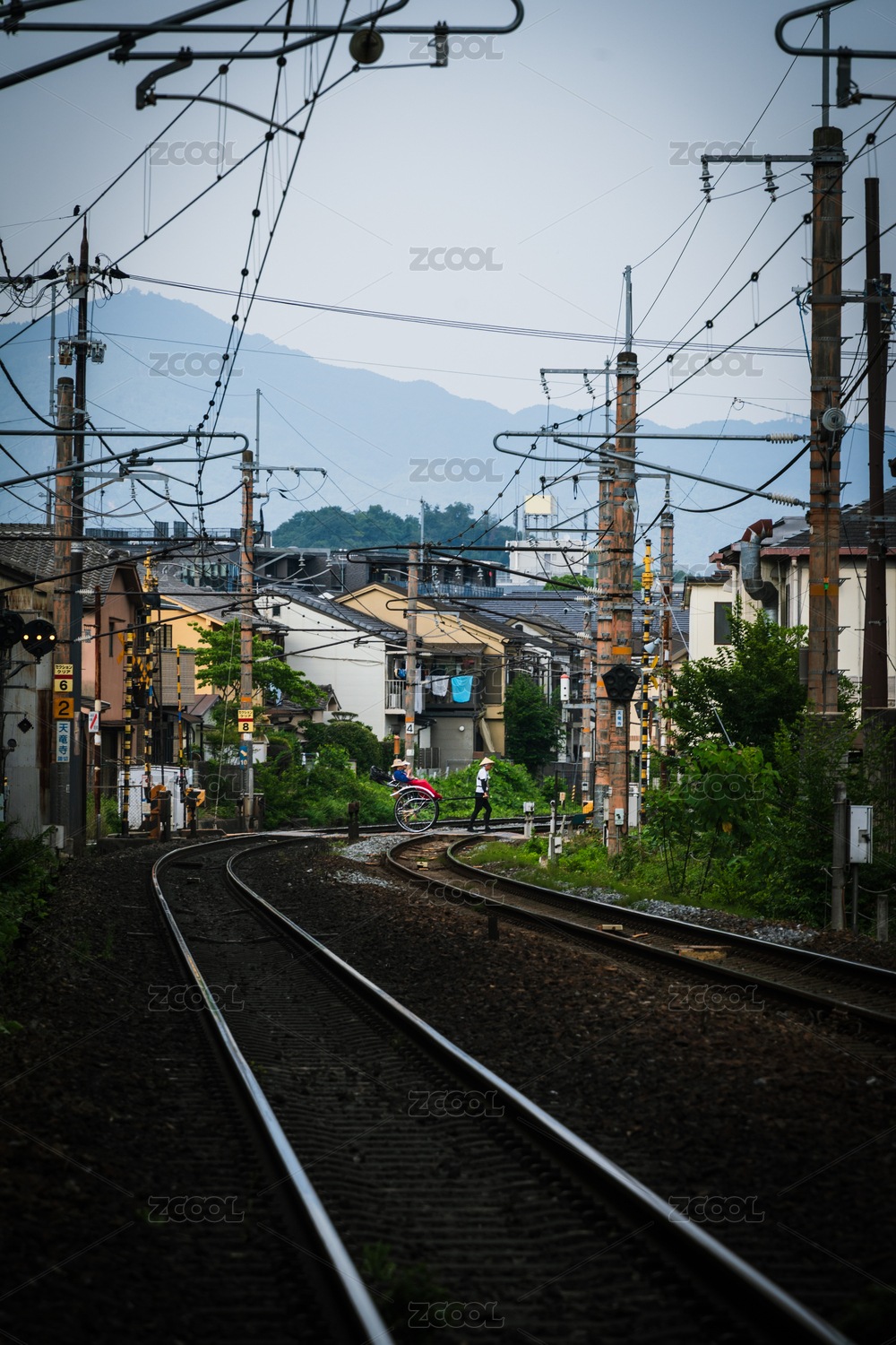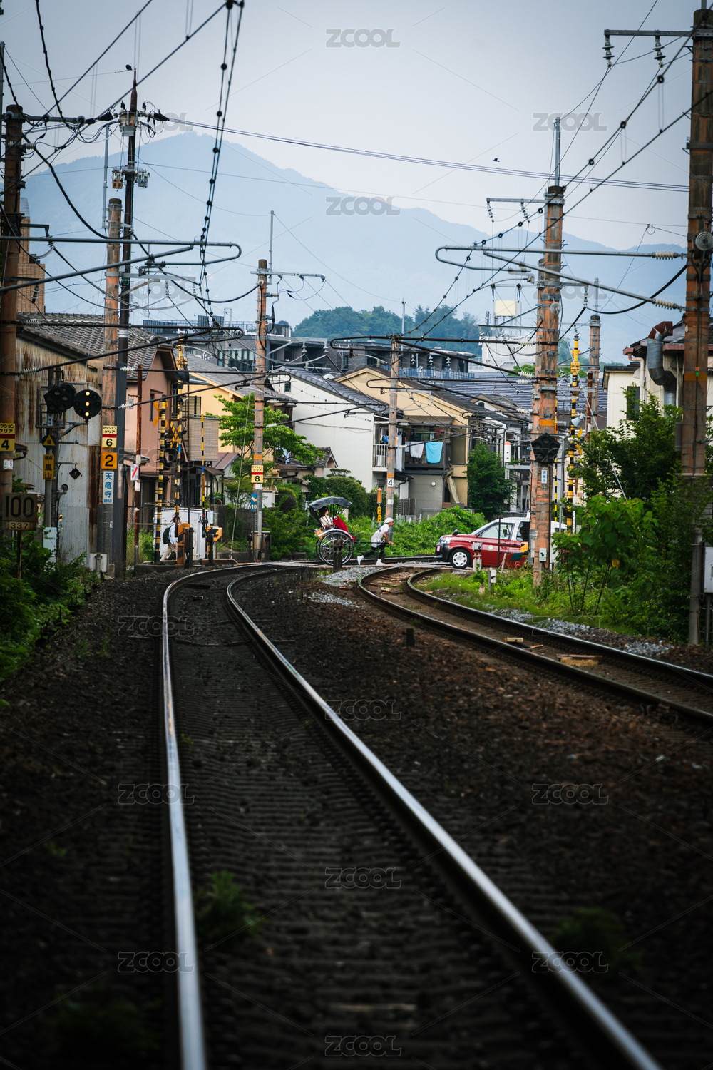日本京都嵐山一輛傳統(tǒng)人力車穿過鐵軌