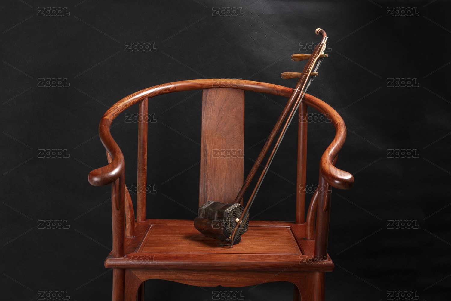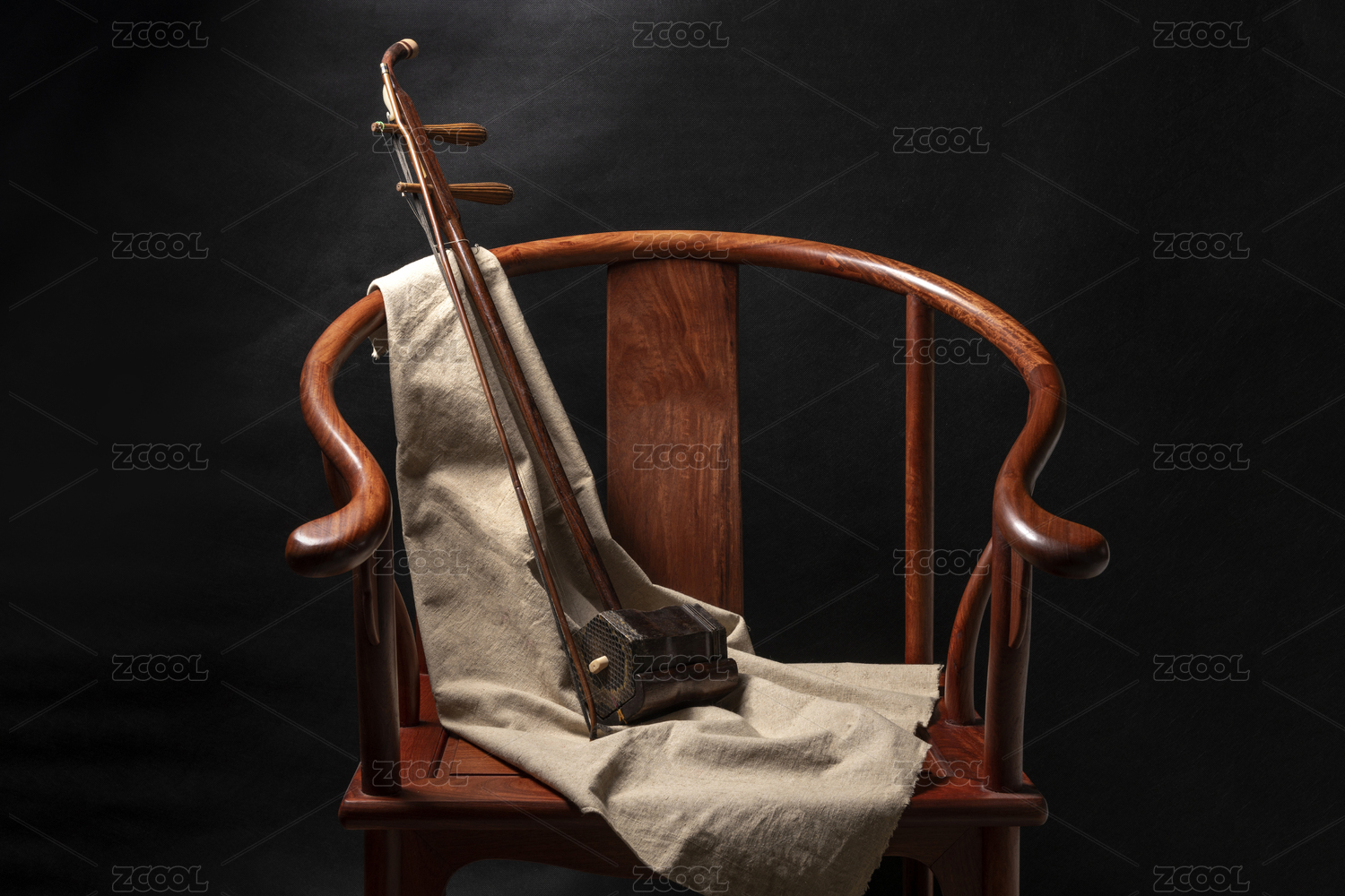 中國(guó)傳統(tǒng)民樂(lè)樂(lè)器二胡擺放在圈椅上特寫(xiě)