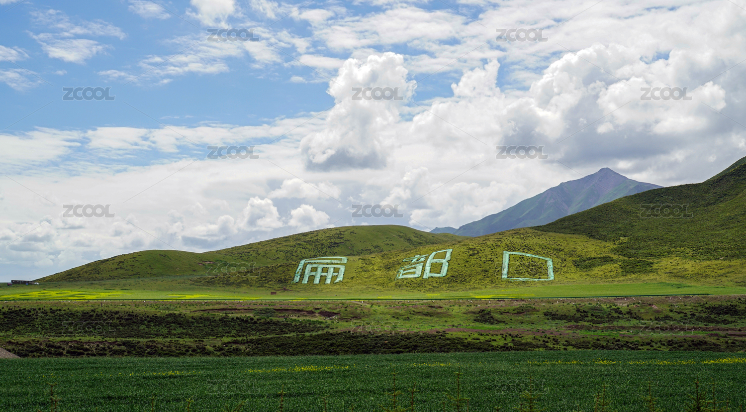 藍(lán)天白云下的甘肅民樂(lè)油菜花和山丘