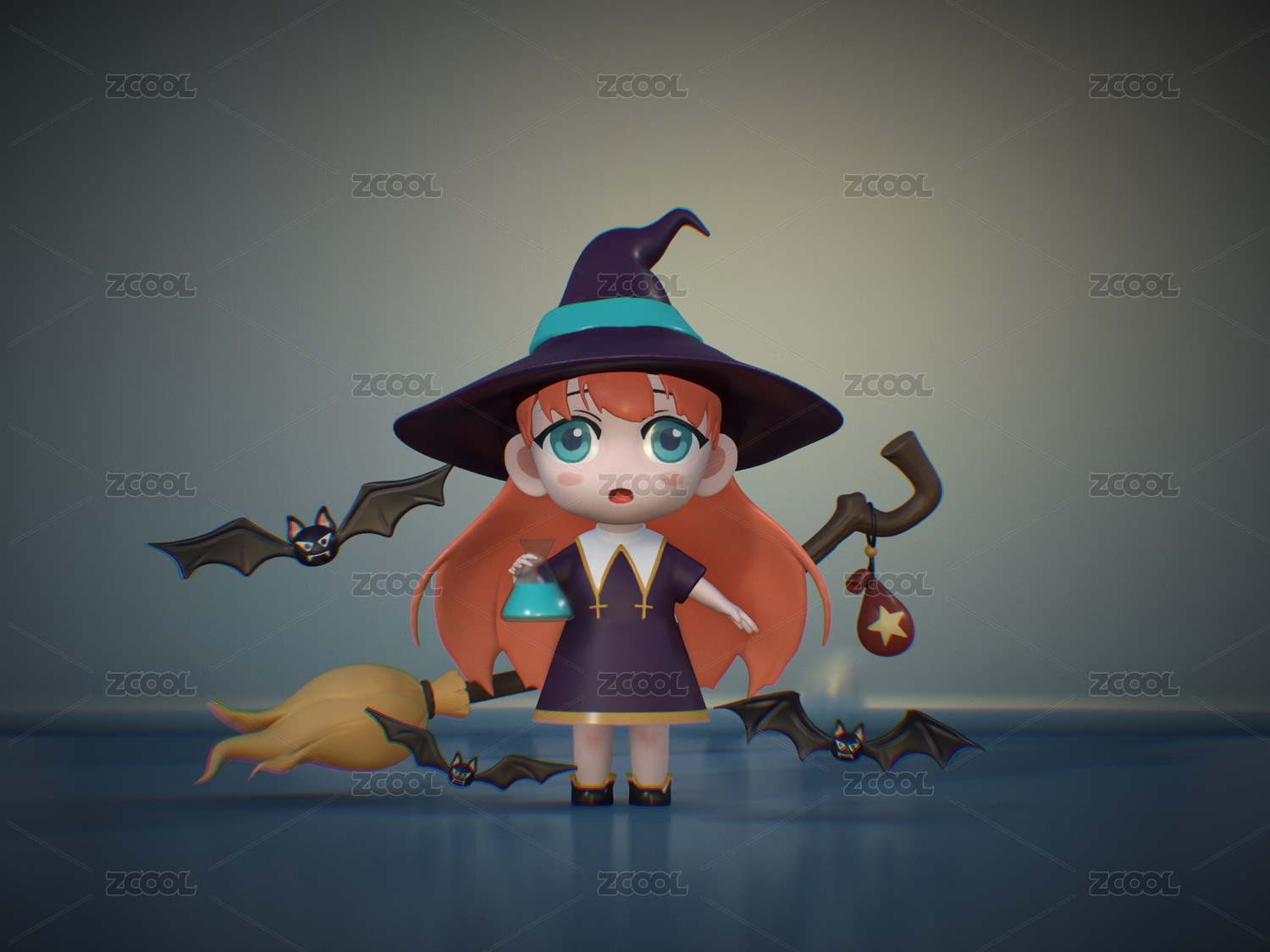 3D戴帽子和掃帚的魔法女巫與蝙蝠未打光
