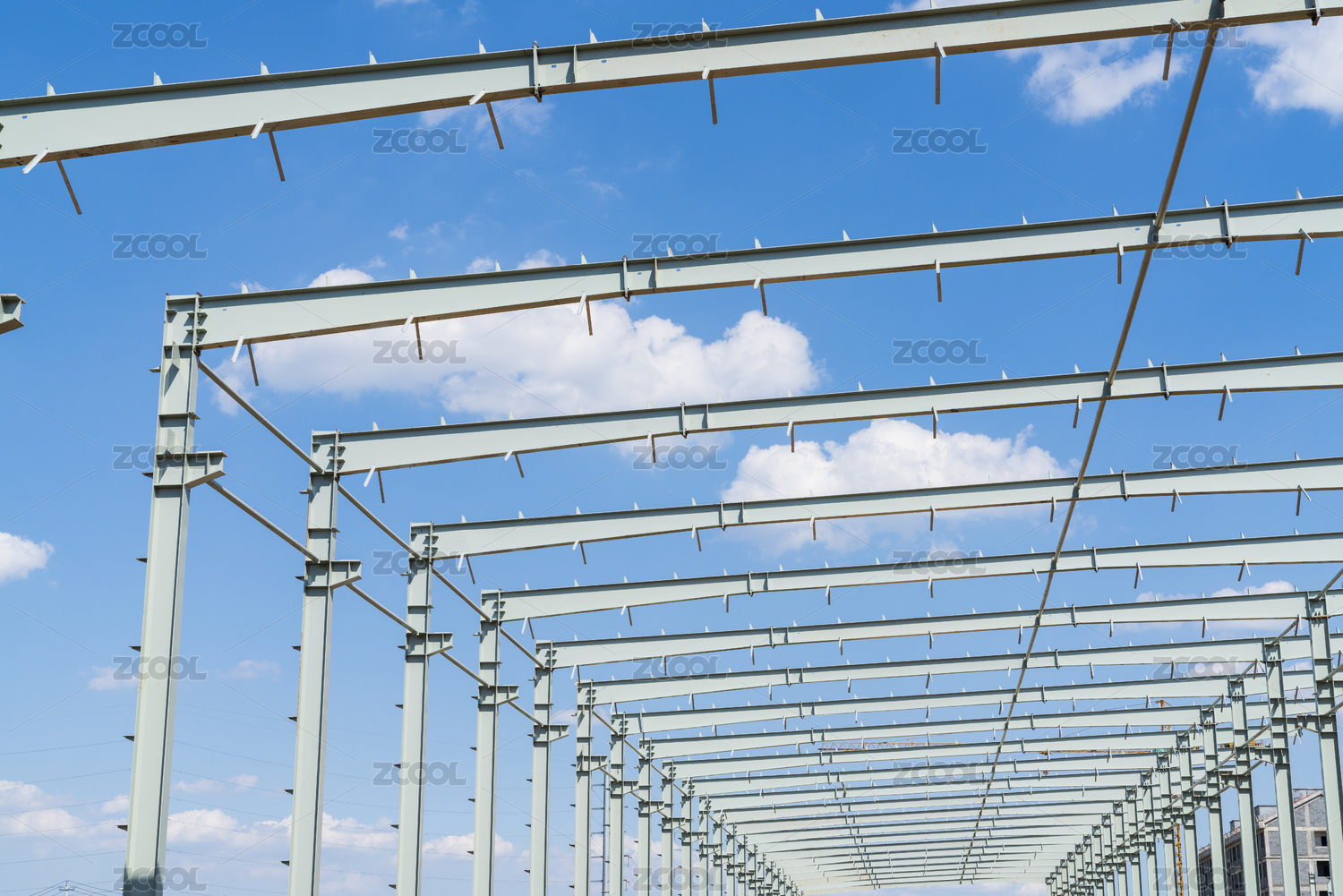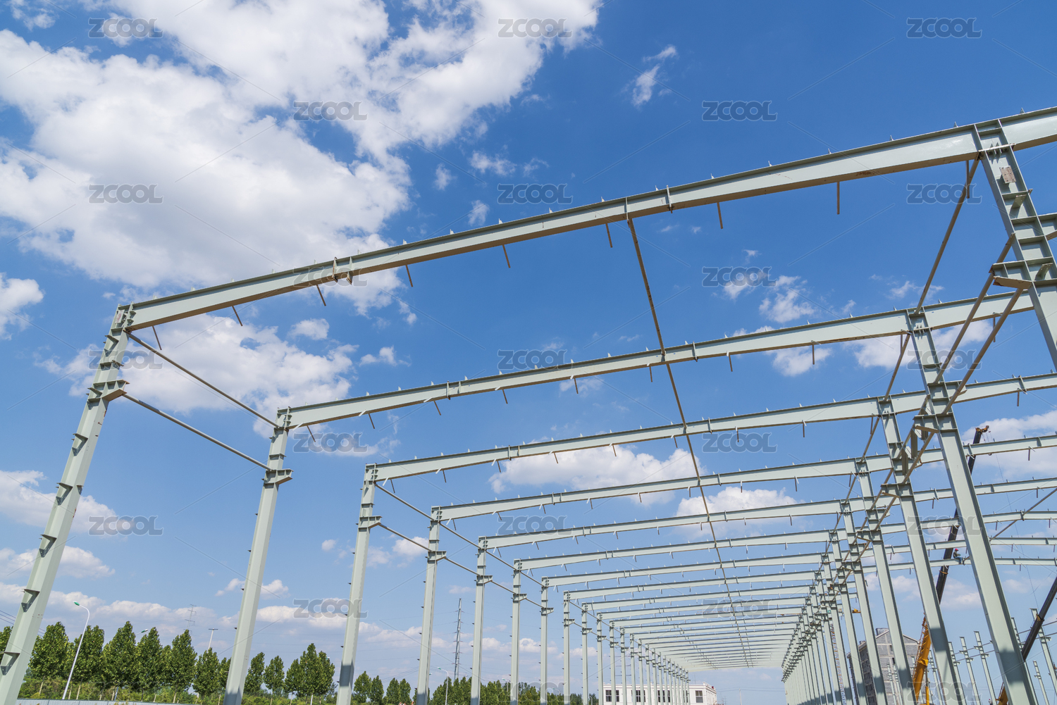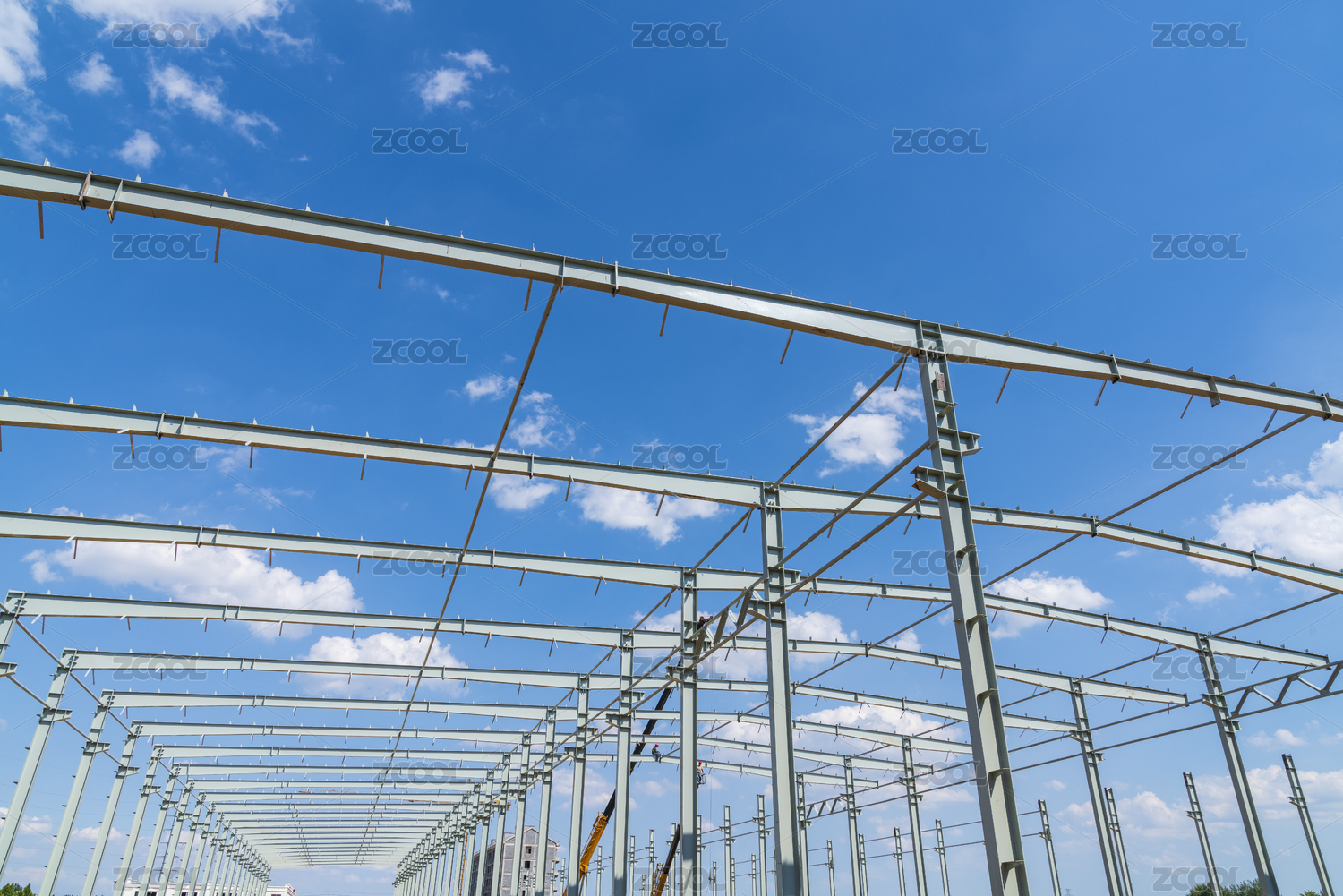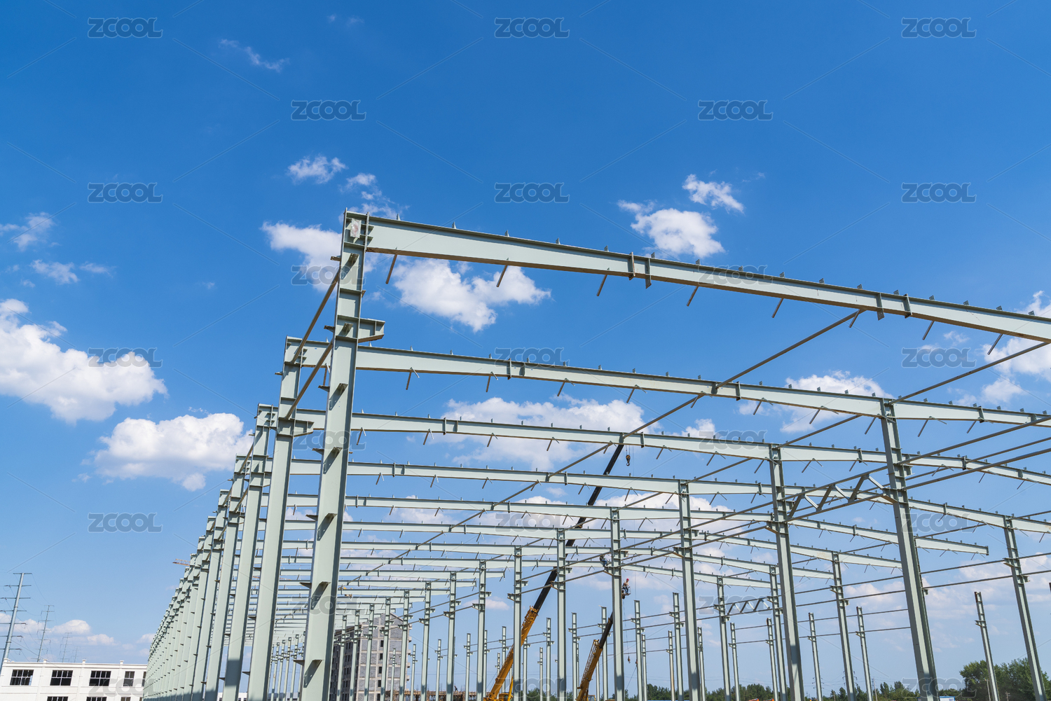 建設(shè)中的鋼架結(jié)構(gòu)廠房在藍(lán)天白云下