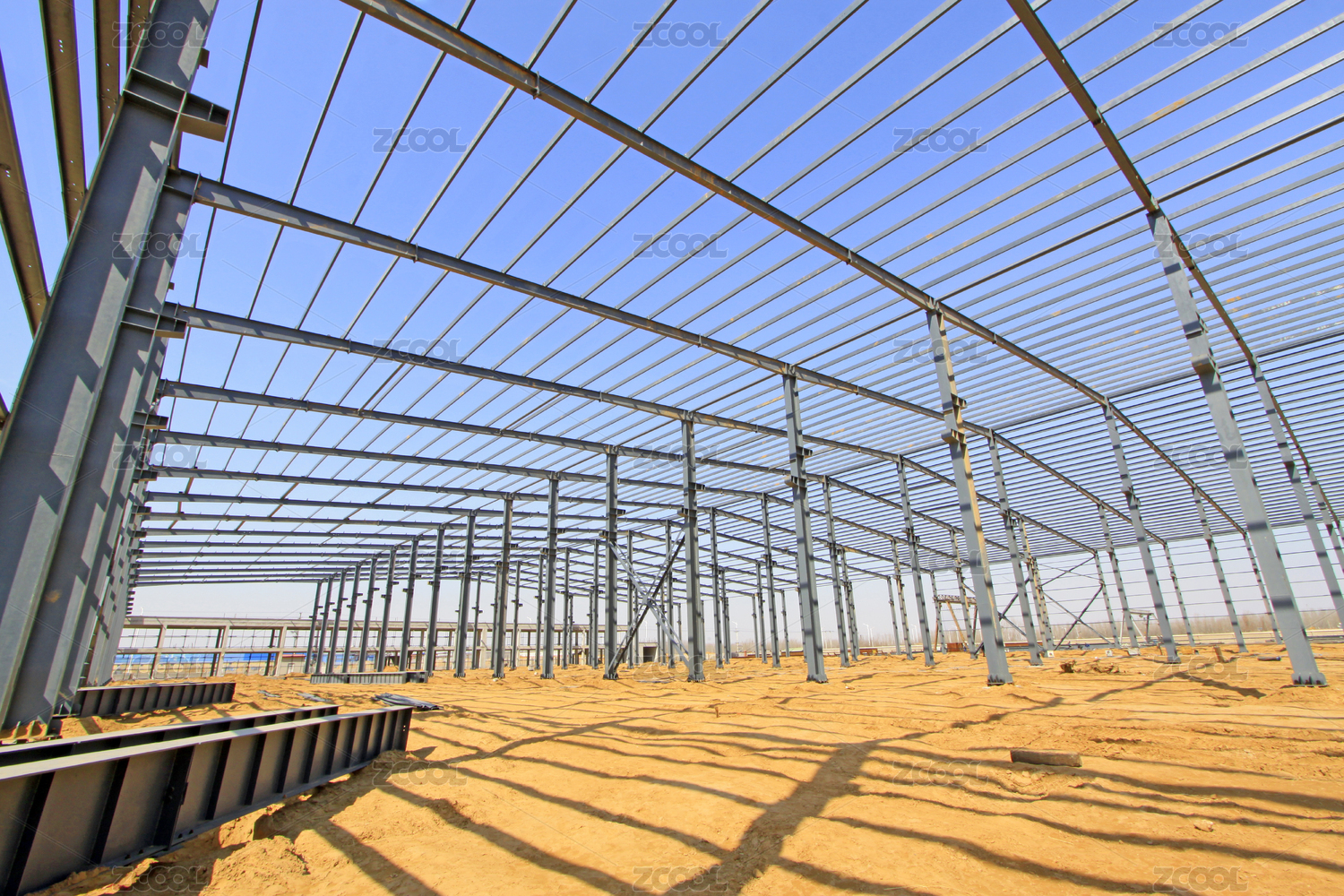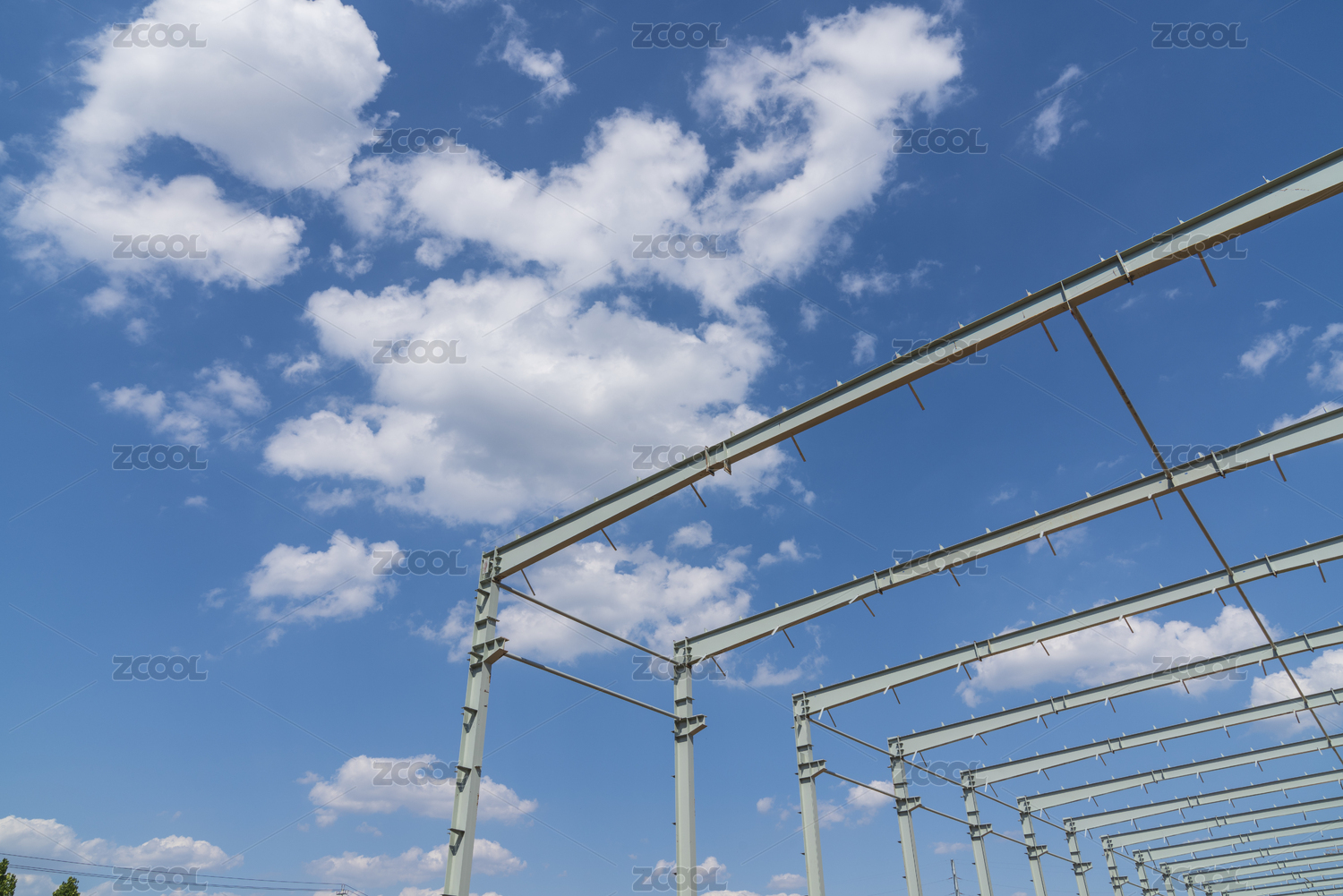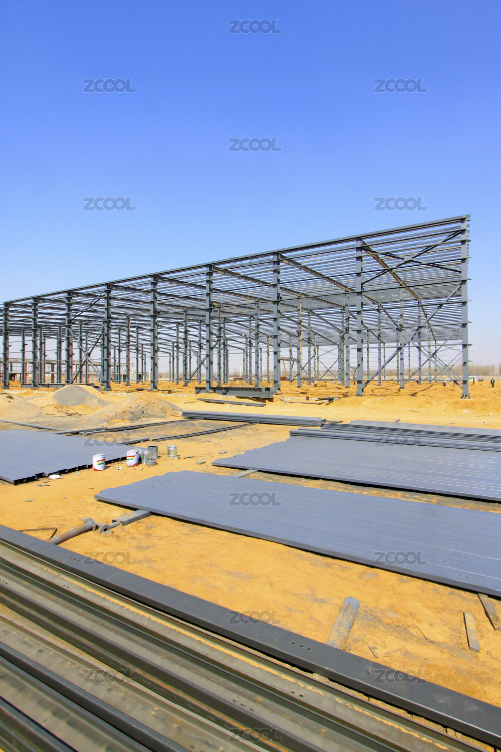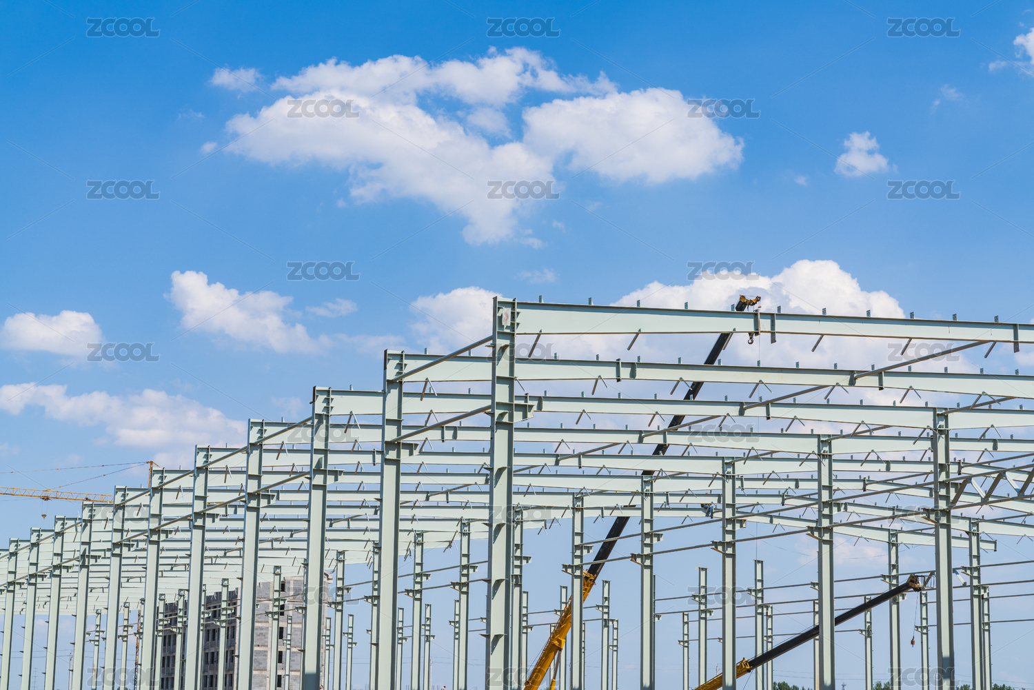建設(shè)中的鋼架結(jié)構(gòu)廠房在藍(lán)天白云下
