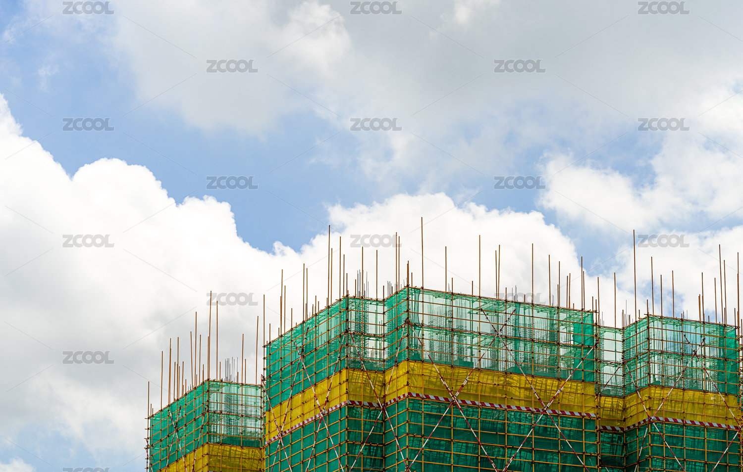 藍(lán)天白云下正在建設(shè)中的高樓鋼架特寫
