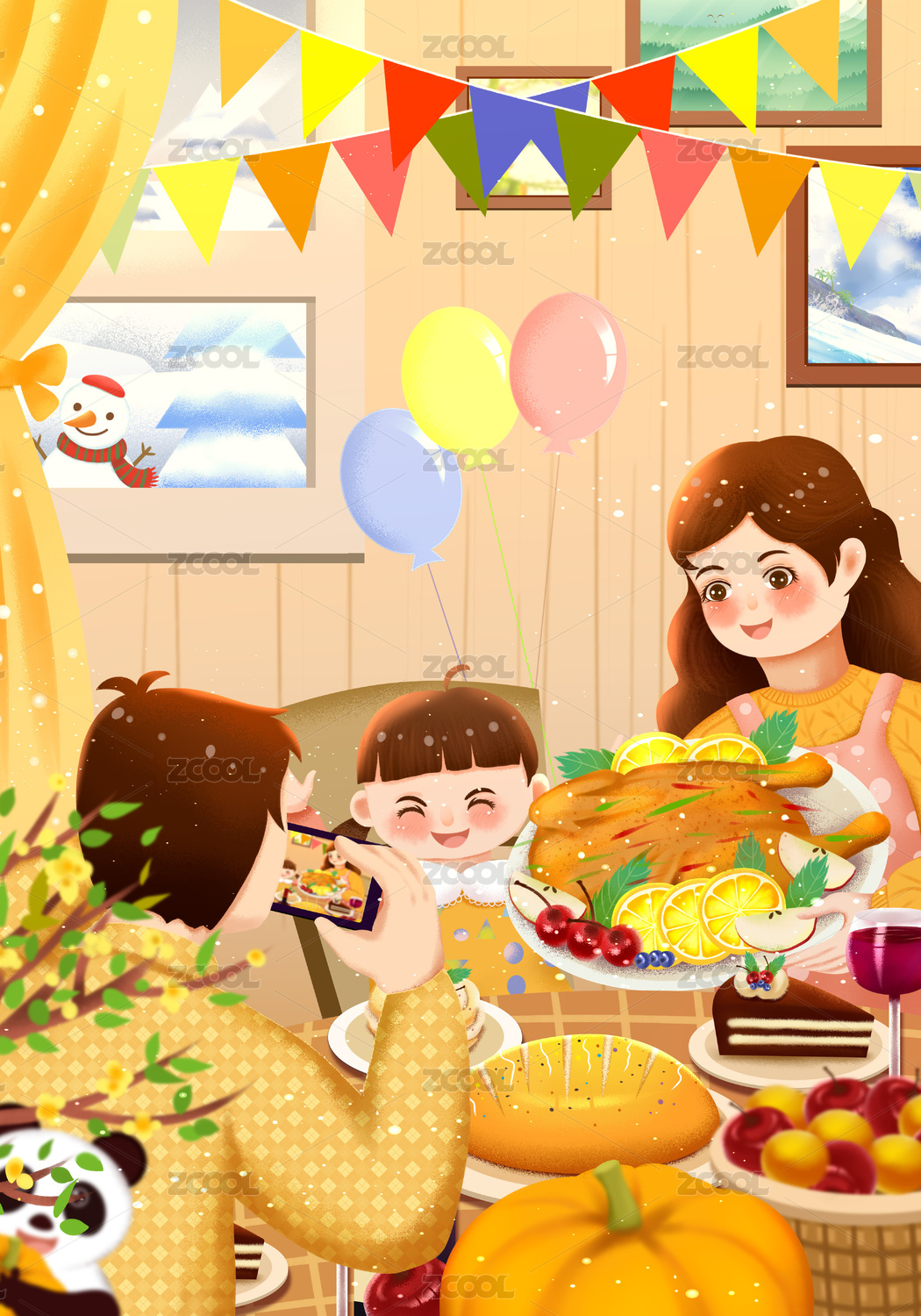 手繪感恩節(jié)插畫(huà)感恩有你全家聚餐