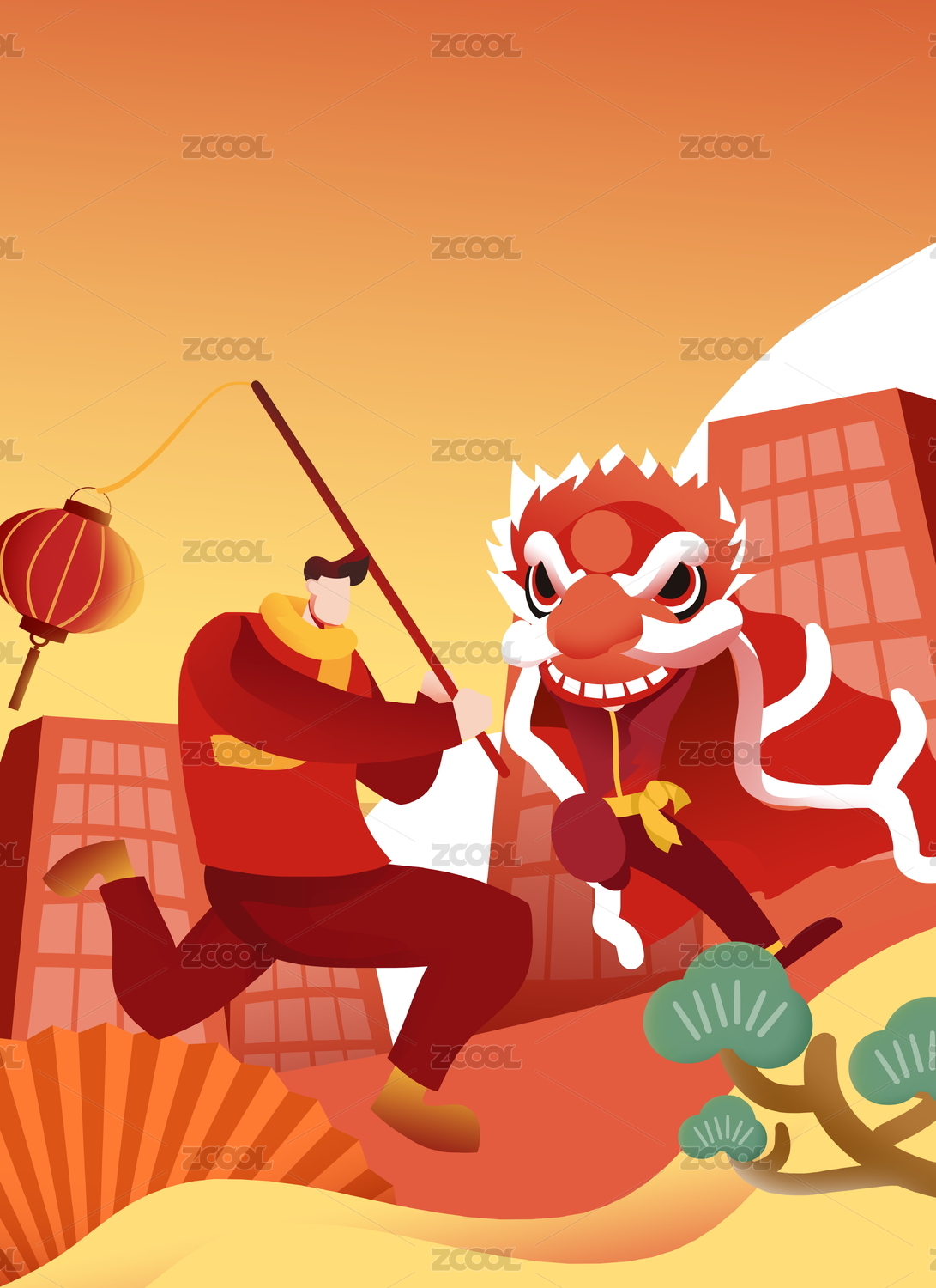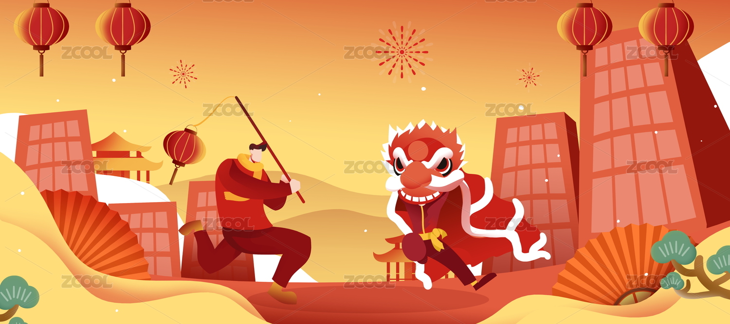 卡通手繪新年舞獅提燈籠紅色喜慶詳情頁頭圖插畫