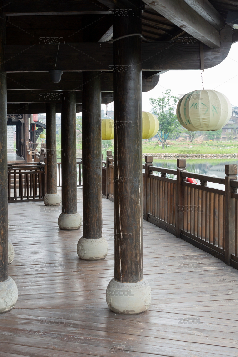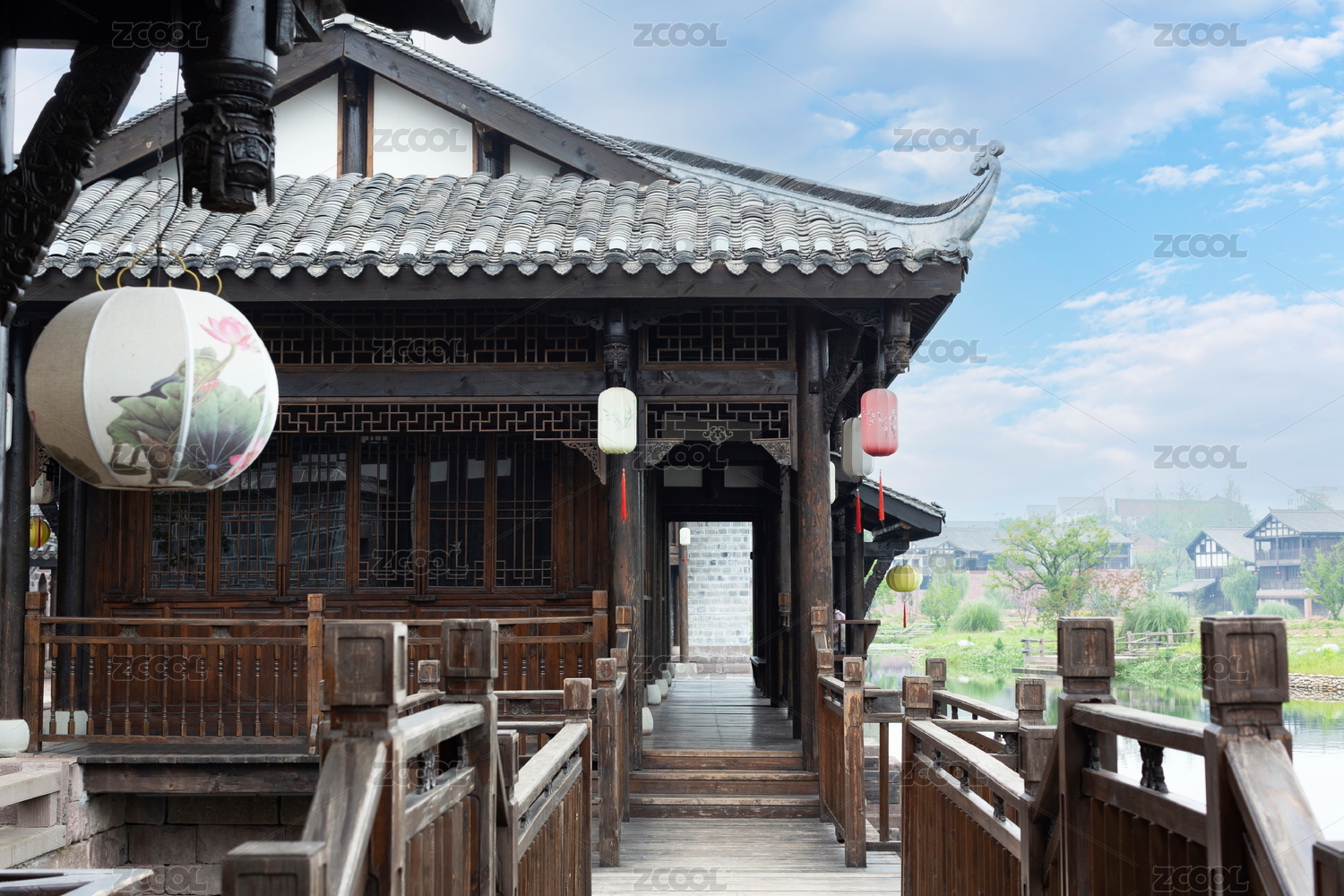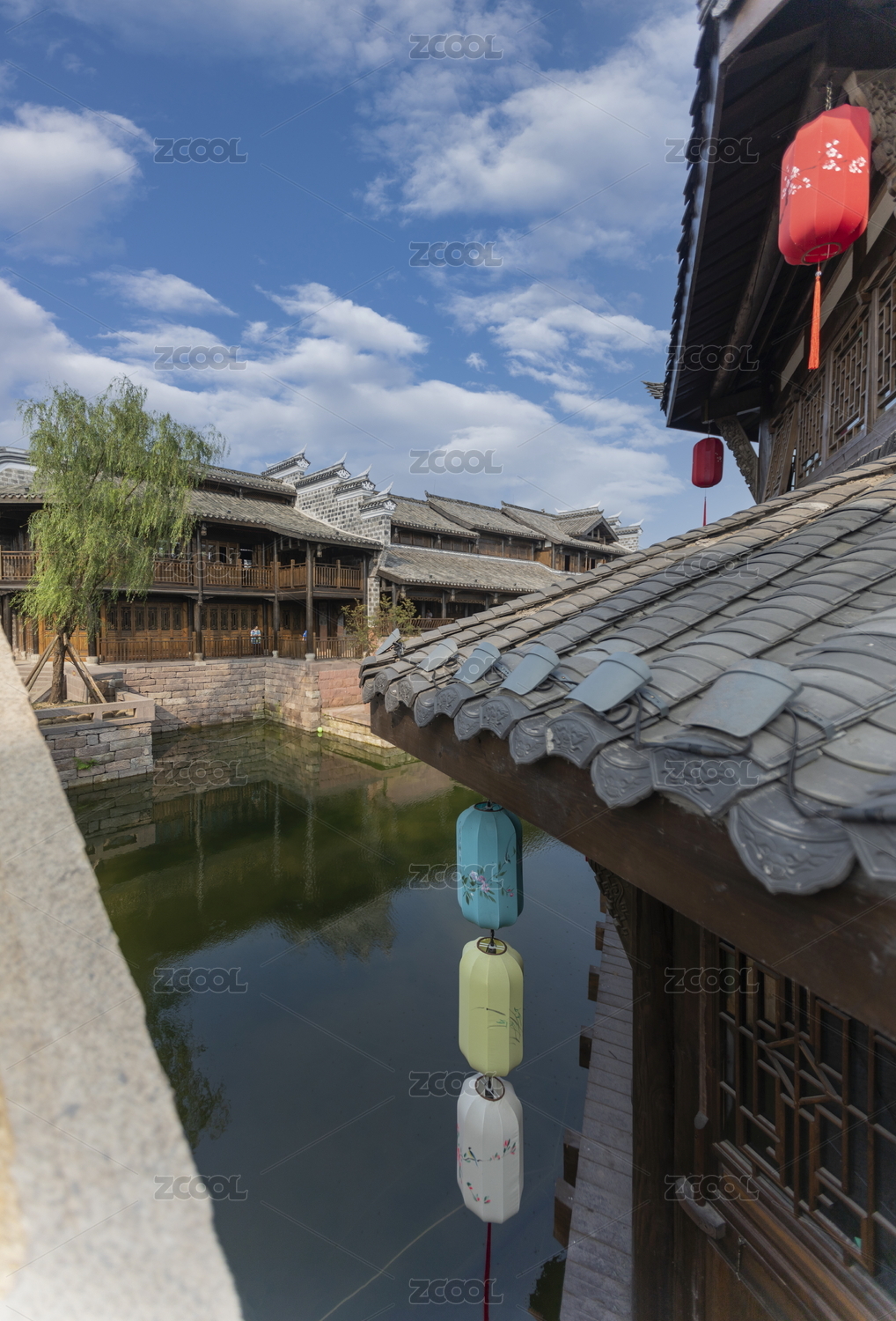 四川宜賓李莊古鎮(zhèn)木結構青瓦房水面光影