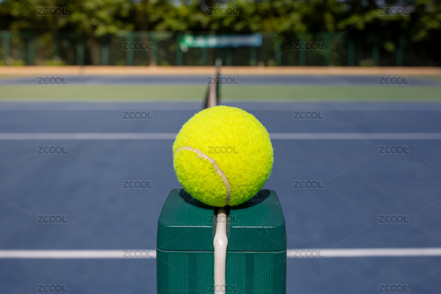網(wǎng)球靜置于網(wǎng)球場(chǎng)邊的網(wǎng)柱上