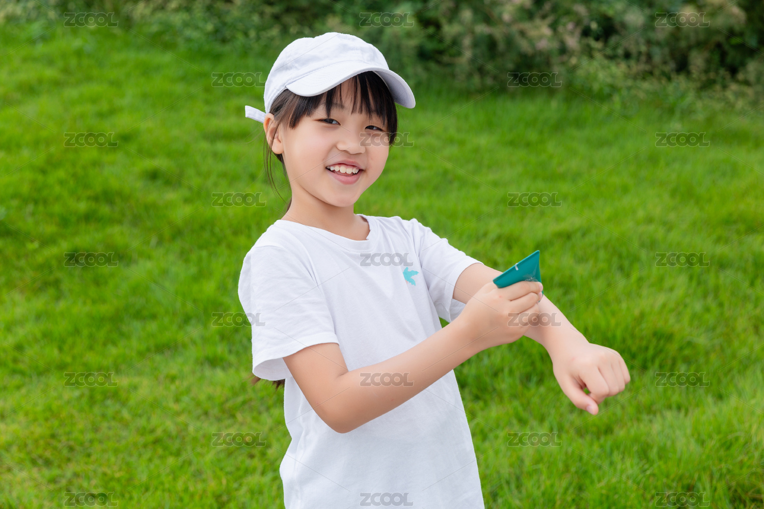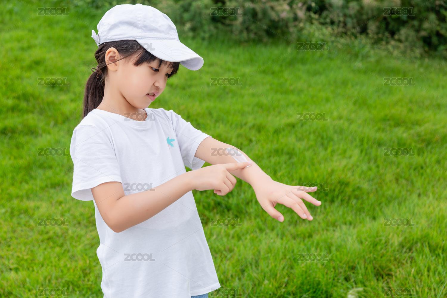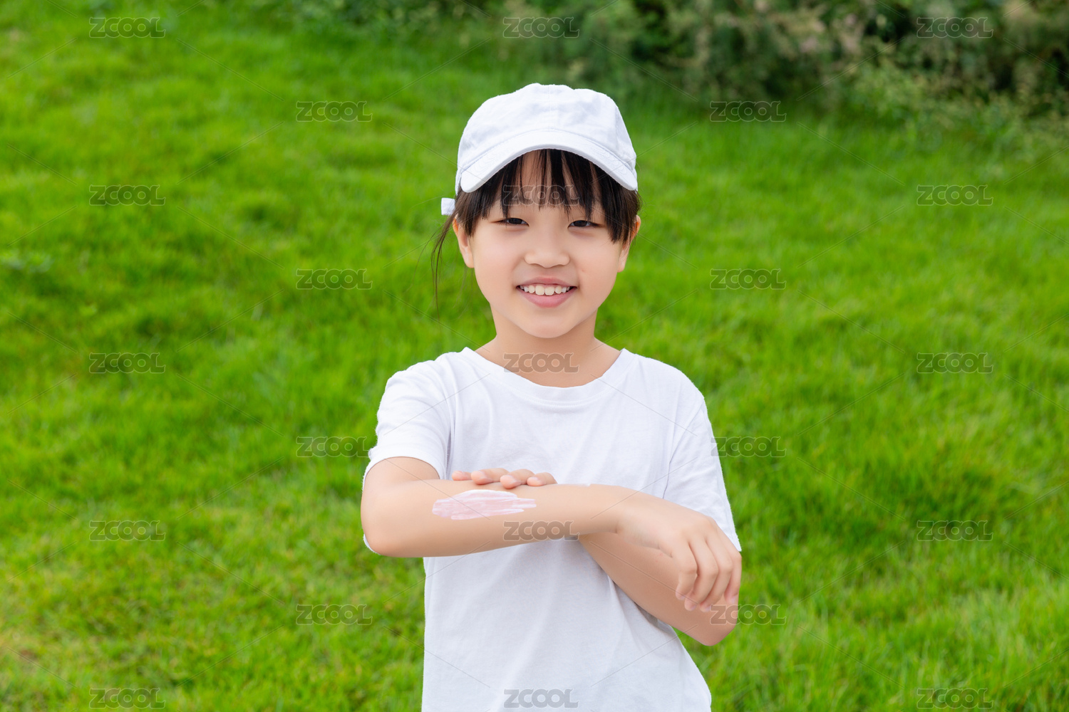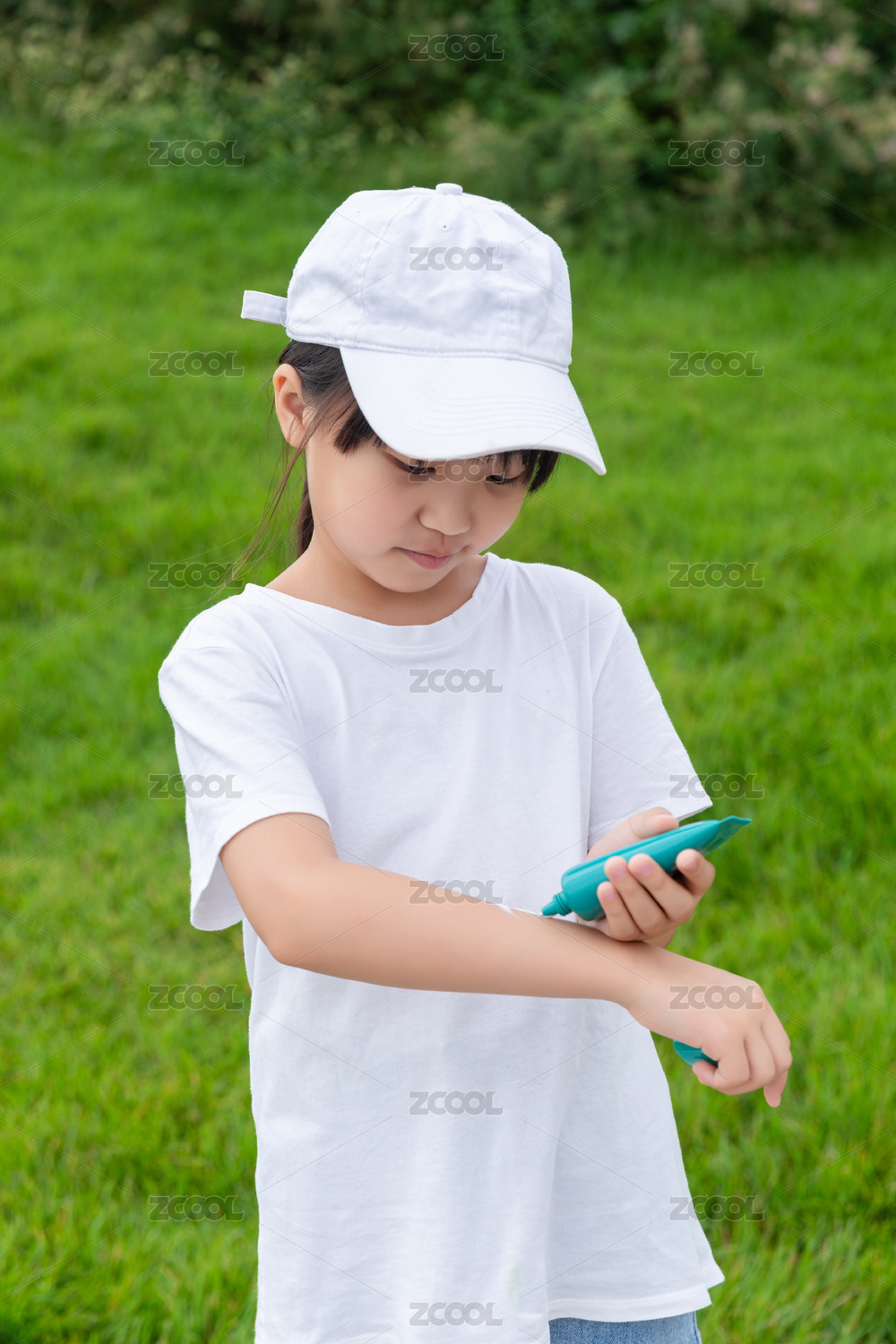 在戶外涂抹防曬霜的亞洲小女孩