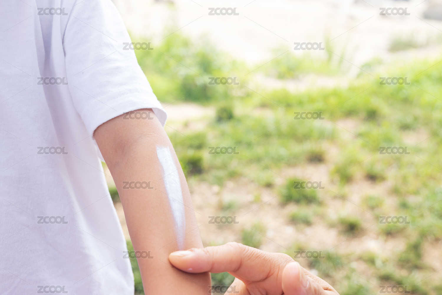 戶外玩耍時在胳膊上涂抹防曬霜