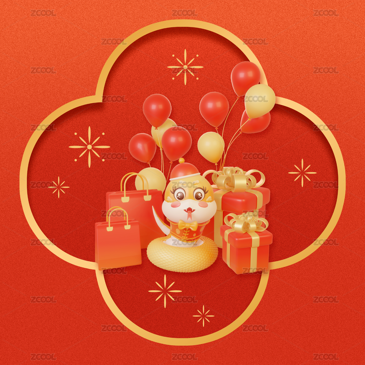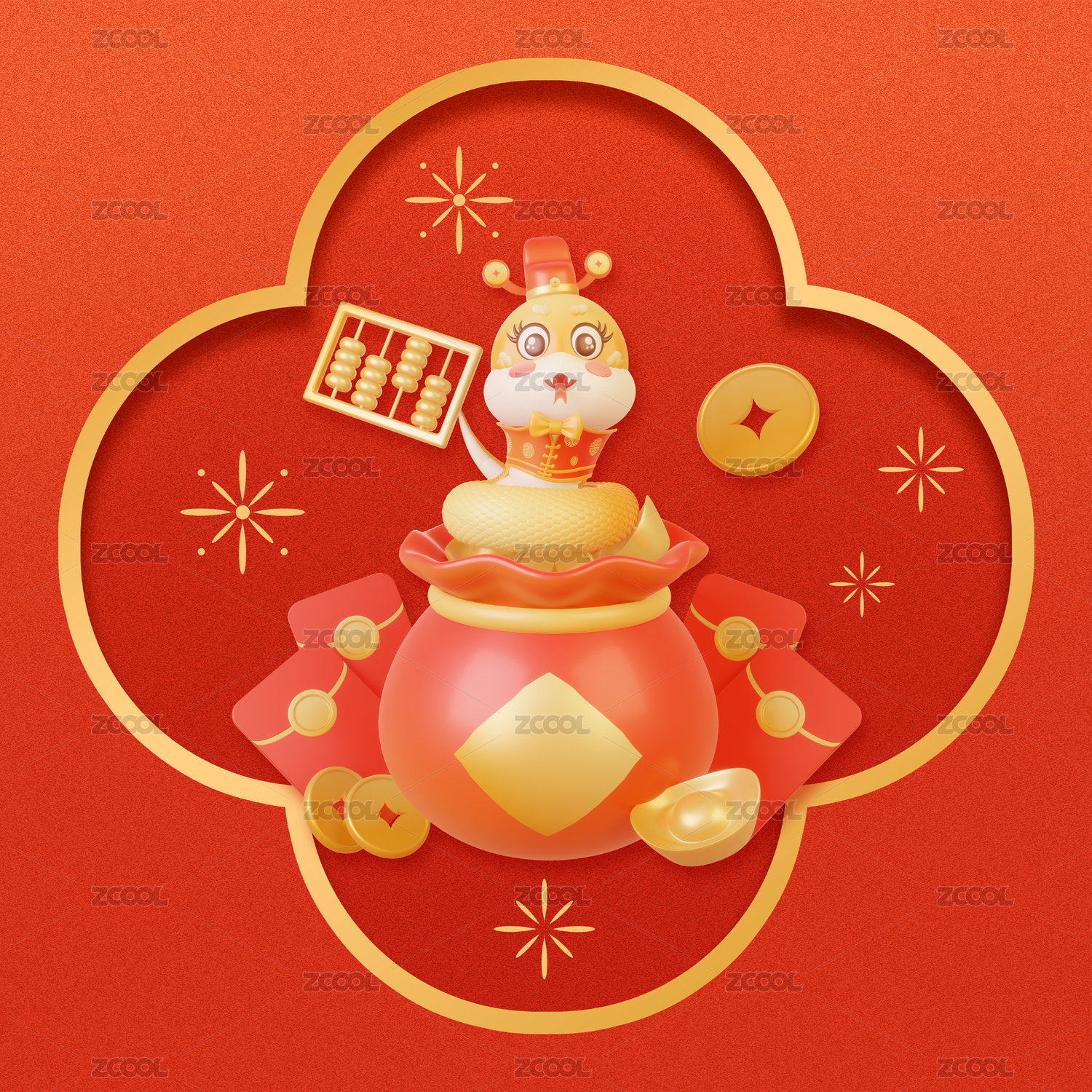 3d蛇年金蛇春節(jié)紅金色金融理財(cái)方形插畫