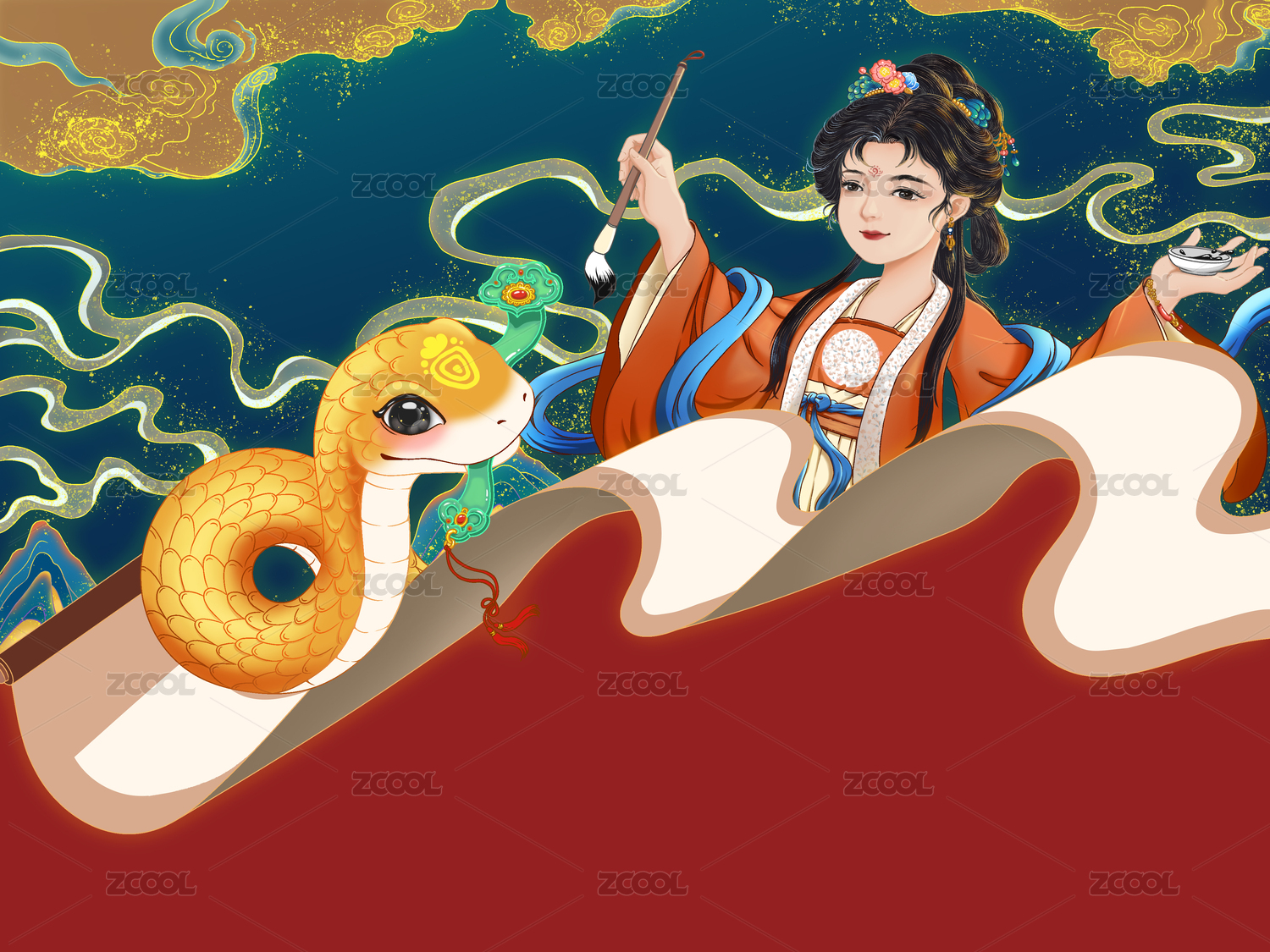 古風(fēng)美人金蛇插畫背景板