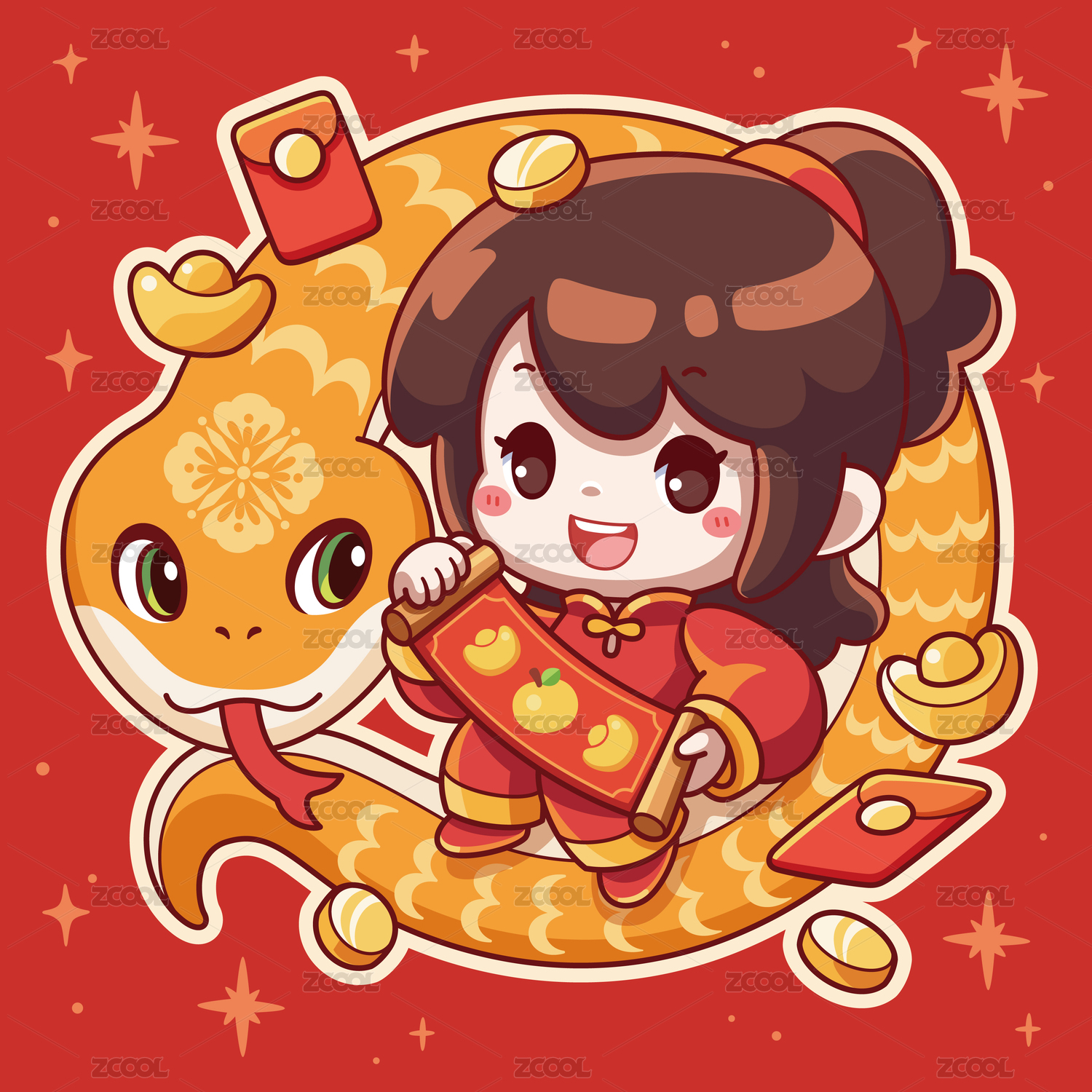 一條金蛇絲帶中國紅背景生肖屬相蛇年插畫