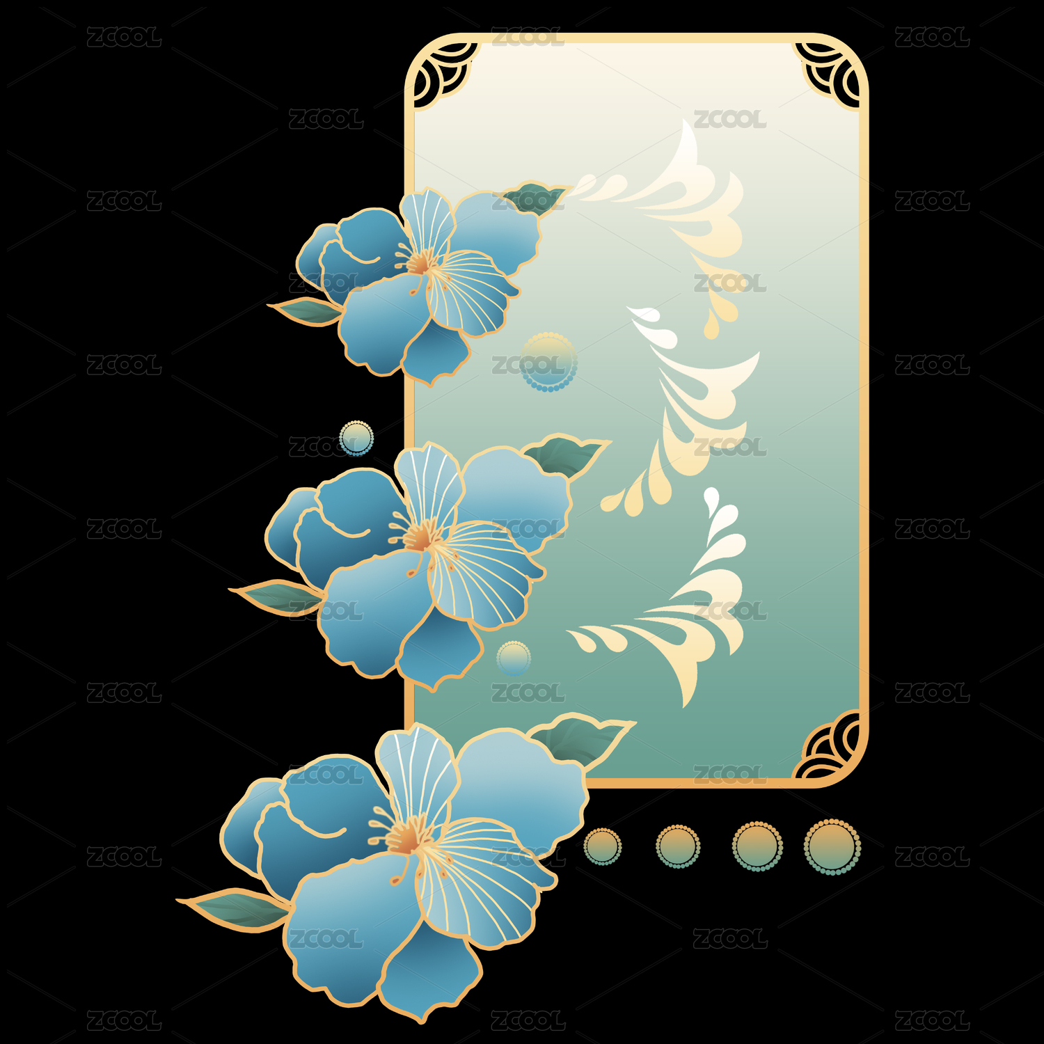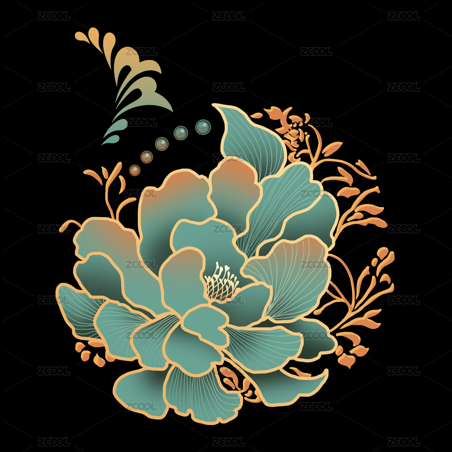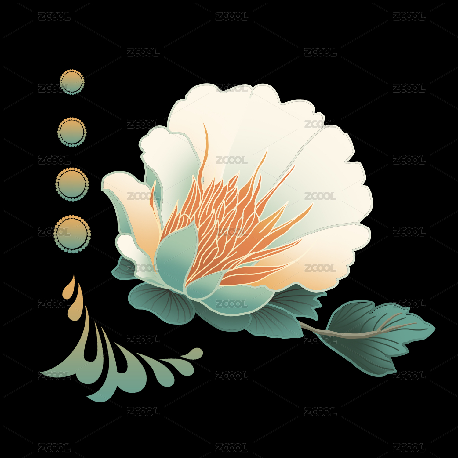 國潮中式元素紋樣綠色金色白玉花團(tuán)裝飾圖案