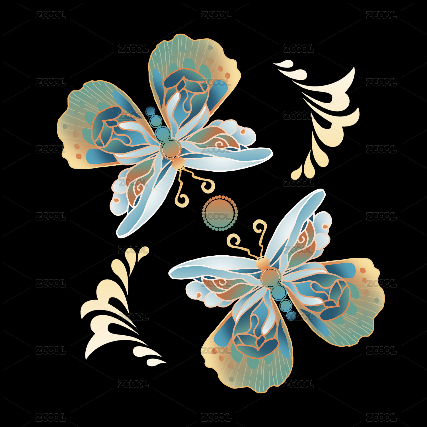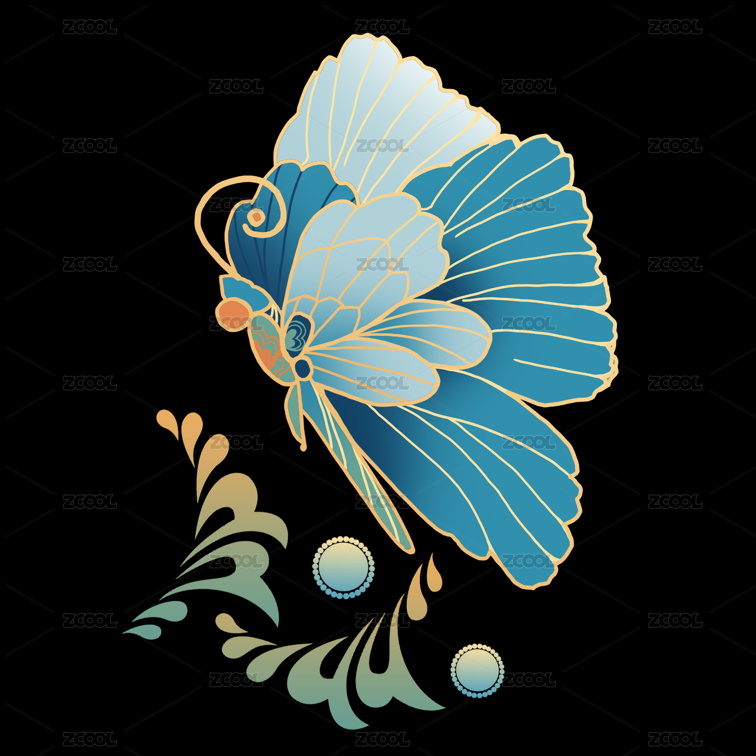 國潮中式元素紋樣綠色金色蝴蝶花團(tuán)裝飾圖案