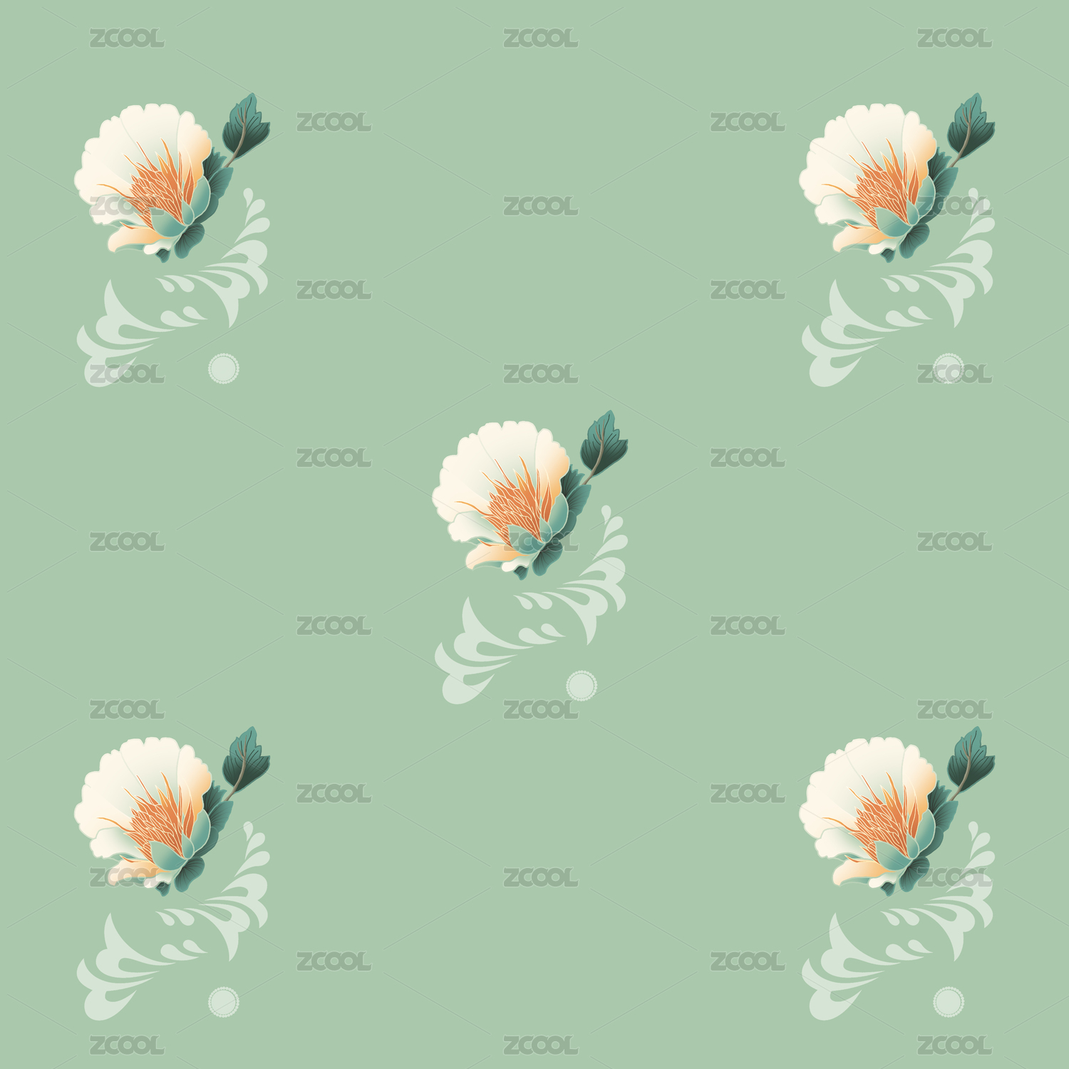 國潮中式元素紋樣綠色牡丹花團(tuán)裝飾圖案