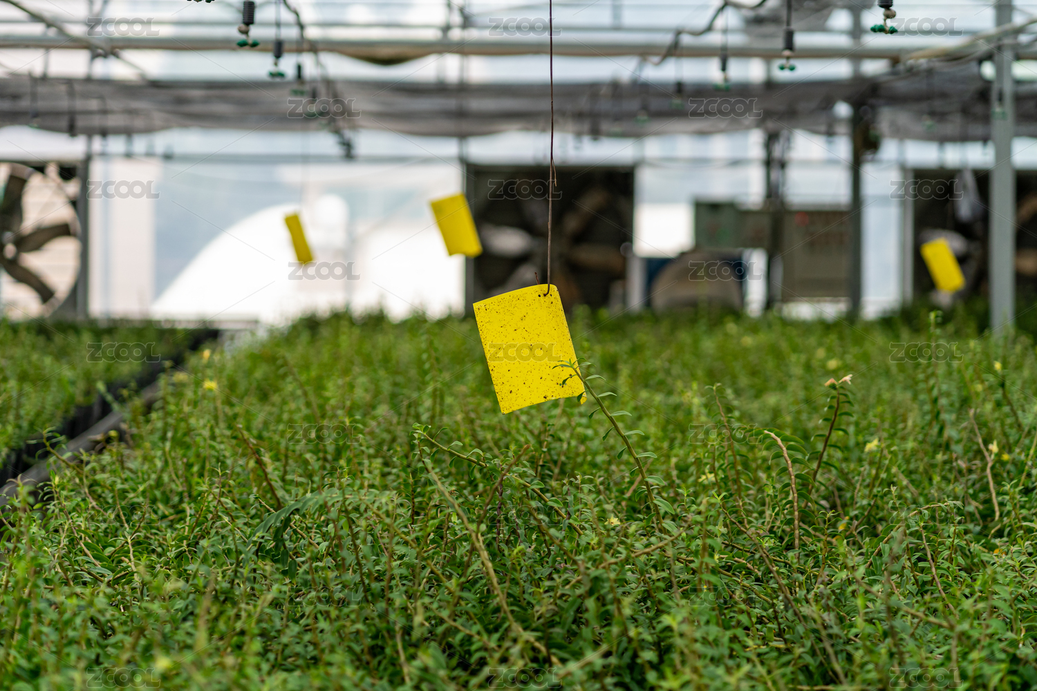 溫室大棚內(nèi)栽培的鐵皮石斛苗及黃色粘蟲(chóng)板