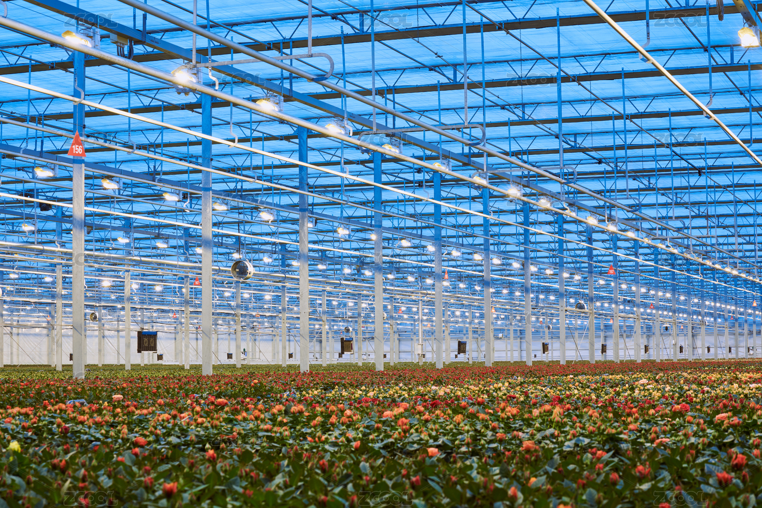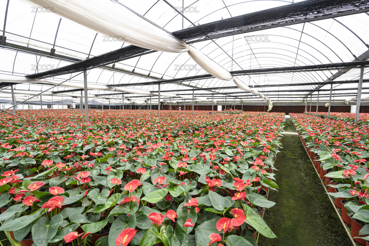 鋼架大棚內(nèi)成片種植的紅掌花卉