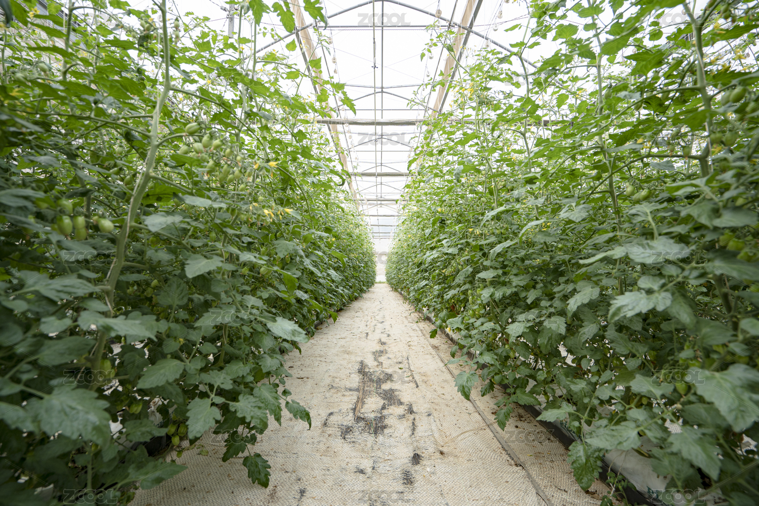 鋼架大棚內(nèi)長(zhǎng)勢(shì)旺盛的西紅柿植株