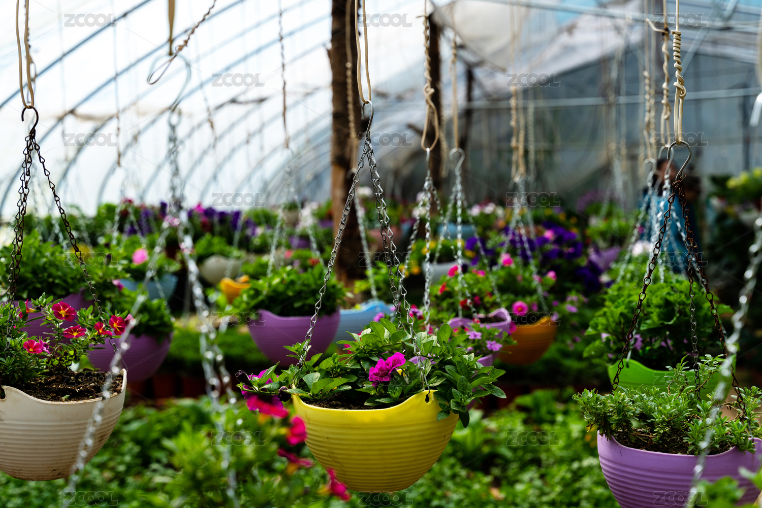 生態(tài)大棚里,懸掛著各種各樣的鮮花盆栽